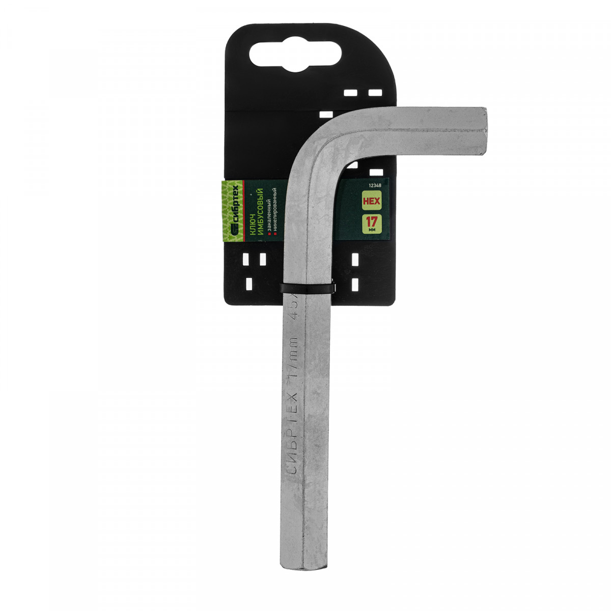 Ключ имбусовый никелированный Сибртех 12348 размером 17 мм, из закаленной стали 45Х, используется для монтажа и демонтажа резьбового крепежа с шестигранным шлицем HEX. Пригодится для сборки мебели, ремонта бытовой техники, велосипедов и автомобилей.