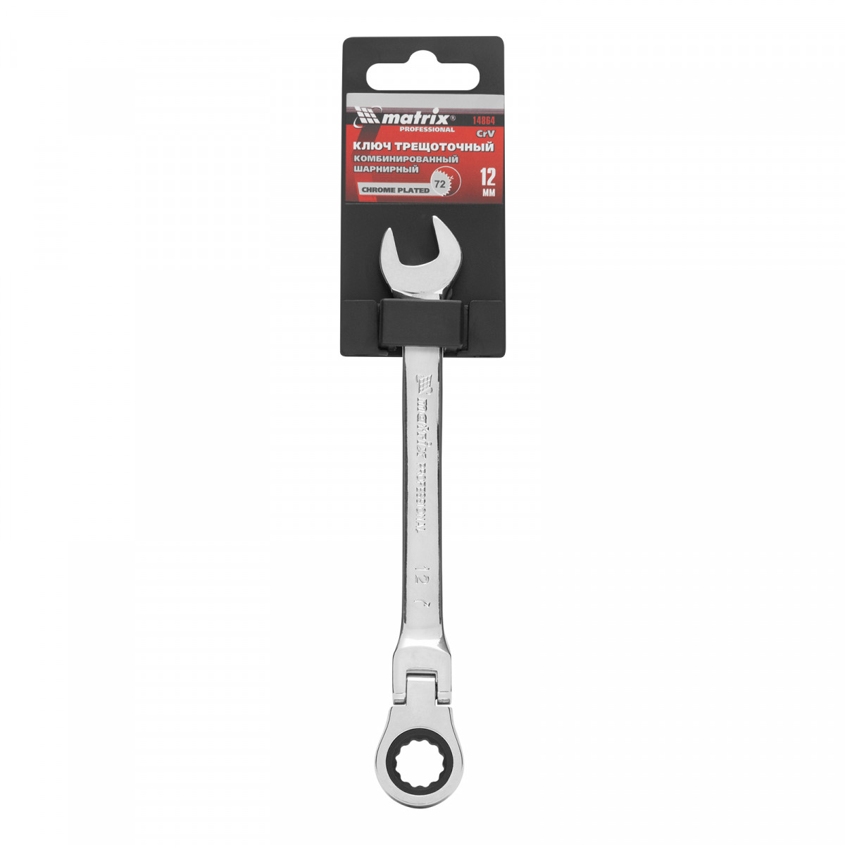 Ключ комбинированный трещоточный, 12 мм, CrV, шарнирный, зеркальный хром Matrix Professional