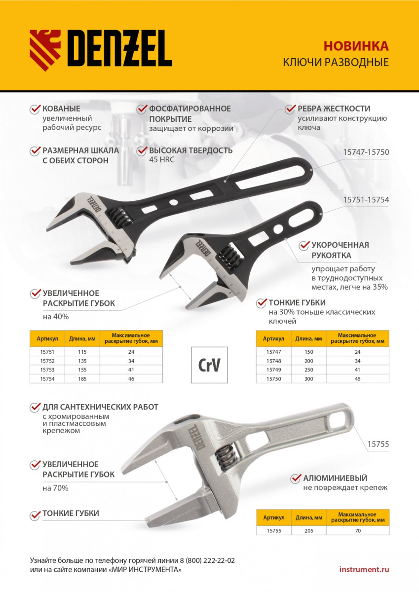 Ключ разводной кованый Denzel 15754 длиной 185 мм, из стали CrV, с укороченной рукояткой и увеличенным раскрытием губок, используется для монтажа и демонтажа крепежных элементов диаметром до 46 мм. Благодаря тонким губкам и укороченной рукоятке удобен для работы в труднодоступных местах. Имеет широкую область применения: сантехнические работы, мелкий бытовой ремонт, полупрофессиональная сфера и т. д.