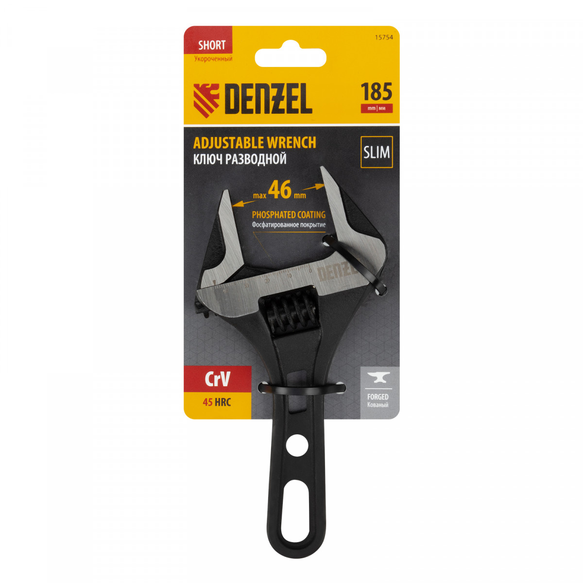Ключ разводной 185 мм, CrV, кованый, укороченная рукоятка Denzel