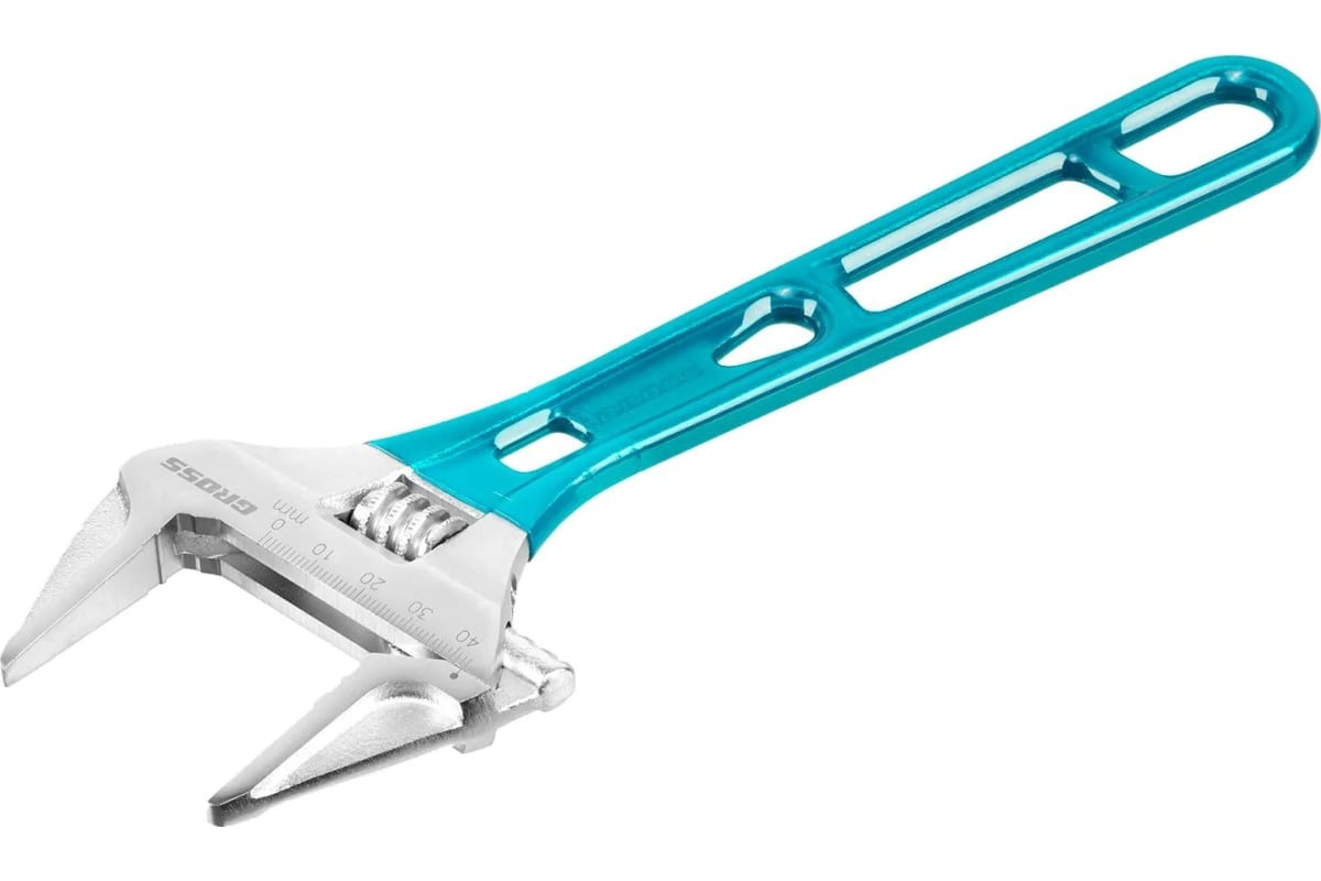 Облегченный разводной ключ подходит для работы как с мелкими, так и с крупными крепежными элементами. Конструкция инструмента усилена благодаря дополнительным ребрам жесткости на рукоятке. Ребристая рабочая поверхность губок обеспечивает надежный захват деталей и повышает точность работы. Надежность — ключ выполнен из высококачественной хромованадиевой стали