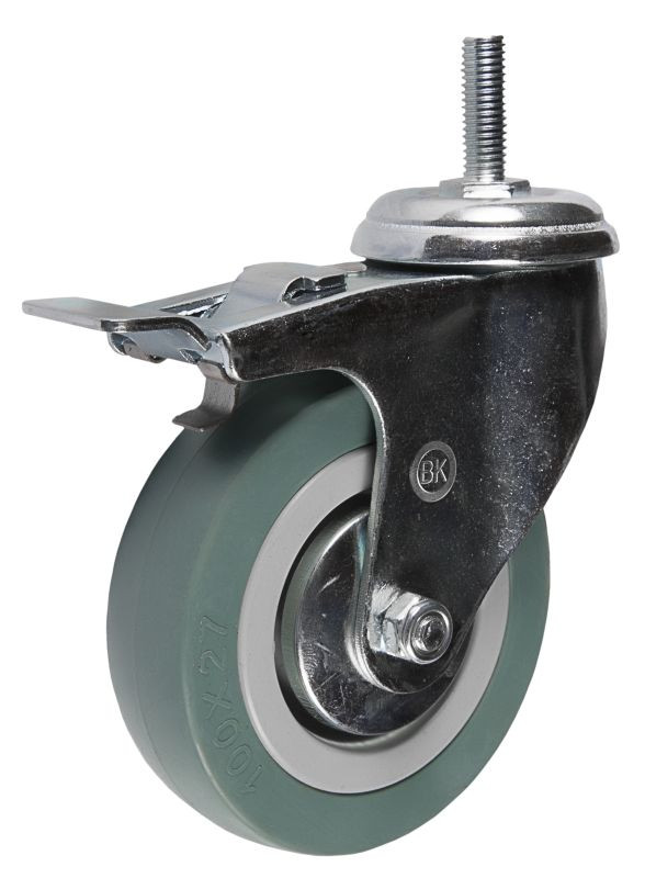 Колесо аппаратное SCtgb42 со штырем и тормозом относится к легкой серии колес. Ободная часть аппаратной колесной опоры со штырем и тормозом SCtgb42 изготовляется из серого полипропилена с двумя боковыми пыльниками, защищающими осевой механизм от повреждения посторонними веществами и пылью.Главной особенностью аппаратных колесных опор со штырем и тормозом SCtgb42 является термоэластичный контактный слой, не наделяющий следами любые поверхности пола. Благодаря отмеченным особенностям шинки, аппаратные колесные опоры со штырем и тормозом SCtgb42 используются для медицинских кроватей и других транспортных конструкций в помещениях с маркими полами, для аппаратуры, бытовой и офисной мебели, для медицинской техники и оборудования, металлической мебели, стеллажей, на тележки-"шпильки"для пищевых производств, для гостиничного оборудования и химчисток.В основе поворотного механизма аппаратной колесной опоры SCtgb42 находится двухрядный шариковый подшипник. В оси колесной опоры аппаратного типа с креплением со штырем применена втулка скольжения. Аппаратные колесные опоры со штырем и тормозом SCtgb42 обладают типовым креплением: отвести предназначенной для вхождения крепежного болта.Термические условия эксплуатации аппаратных колесных опор находятся в рамках от - 20°С до +50°С. Максимальная грузоподъемность колеса SCtgb42 – 55 кг.