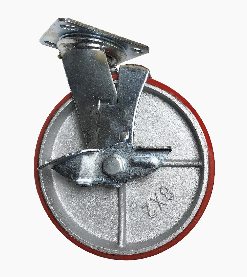 Колесо полиуретановое большегрузное с тормозом SCpb80 для тачек и тележек является грузоподъемным. Чугун служит основой для производства обода полиуретановых колесных опор с тормозом SCpb80.Использование большегрузных полиуретановых колес с тормозом SCpb80 связано с постоянным негативным воздействием на поворотные узлы и механизмы внешней средой. Для того чтобы на протяжения всего срока службы колесная опора с тормозом большегрузного типа из полиуретана SCpb80 обладала плавностью и мягкостью хода предусмотрен ниппель для периодической смазки.В осевом механизме колеса большегрузной колесной опоры с тормозом используется подшипник роликового типа. Опора большегрузного полиуретанового колеса с тормозом, или как ее чаще называют кронштейн, произведена из оцинкованной стали, слой которой не меньше 0,6 см.В механизме вращения и большегрузной полиуретановой колесной опоры с тормозом SCpb80 использован шариковый подшипник двухрядного типа с пресс-масленкой. Платформа колесной опоры большегрузного типа с тормозом из полиуретана SCpb80 обладает четырьмя отверстиями для крепления болтами к основе тачки, тележки и другим транспортным конструкциям.Использование большегрузных полиуретановых колесных опор с тормозом ограничивается следующими термическими условиями от - 35°С до +50°С. Применяются для платформенных тележек, сейфов, шкафов и промышленного оборудования большого веса. Динамическая нагрузка – 350 кг.