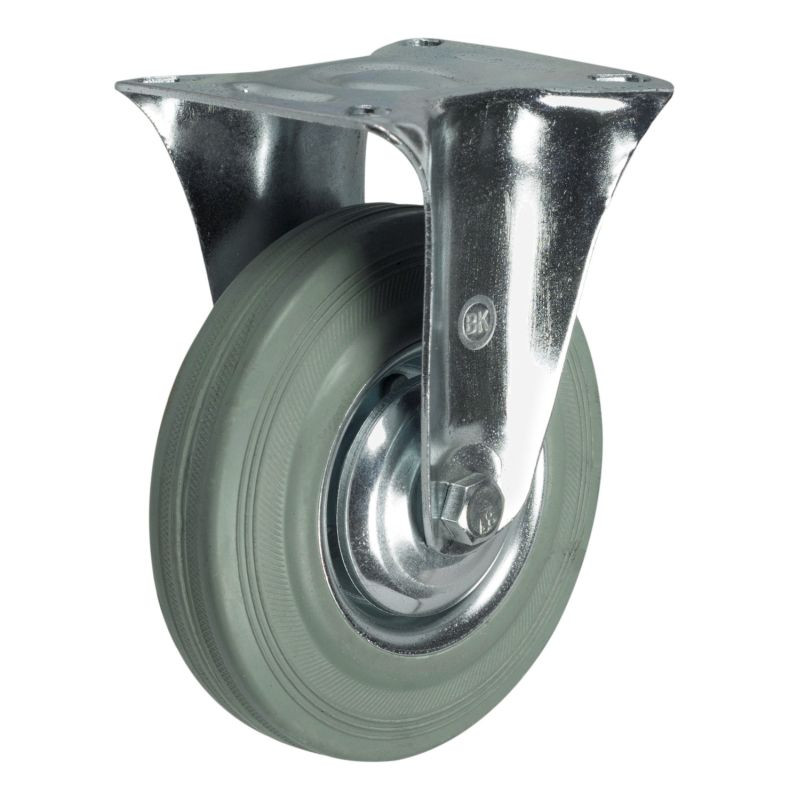 Шинка выполнена из полуэластичной серой резины, прессованный обод из листовой стали. Кронштейн опоры изготовлен из листового металла. Крепление осуществляется через 4 отверстия.