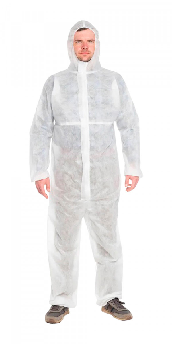 Одноразовый комбинезон белого цвета изготовлен из гипоаллергенного нетканого материала спанбонд плотностью 60гр/м.кв.