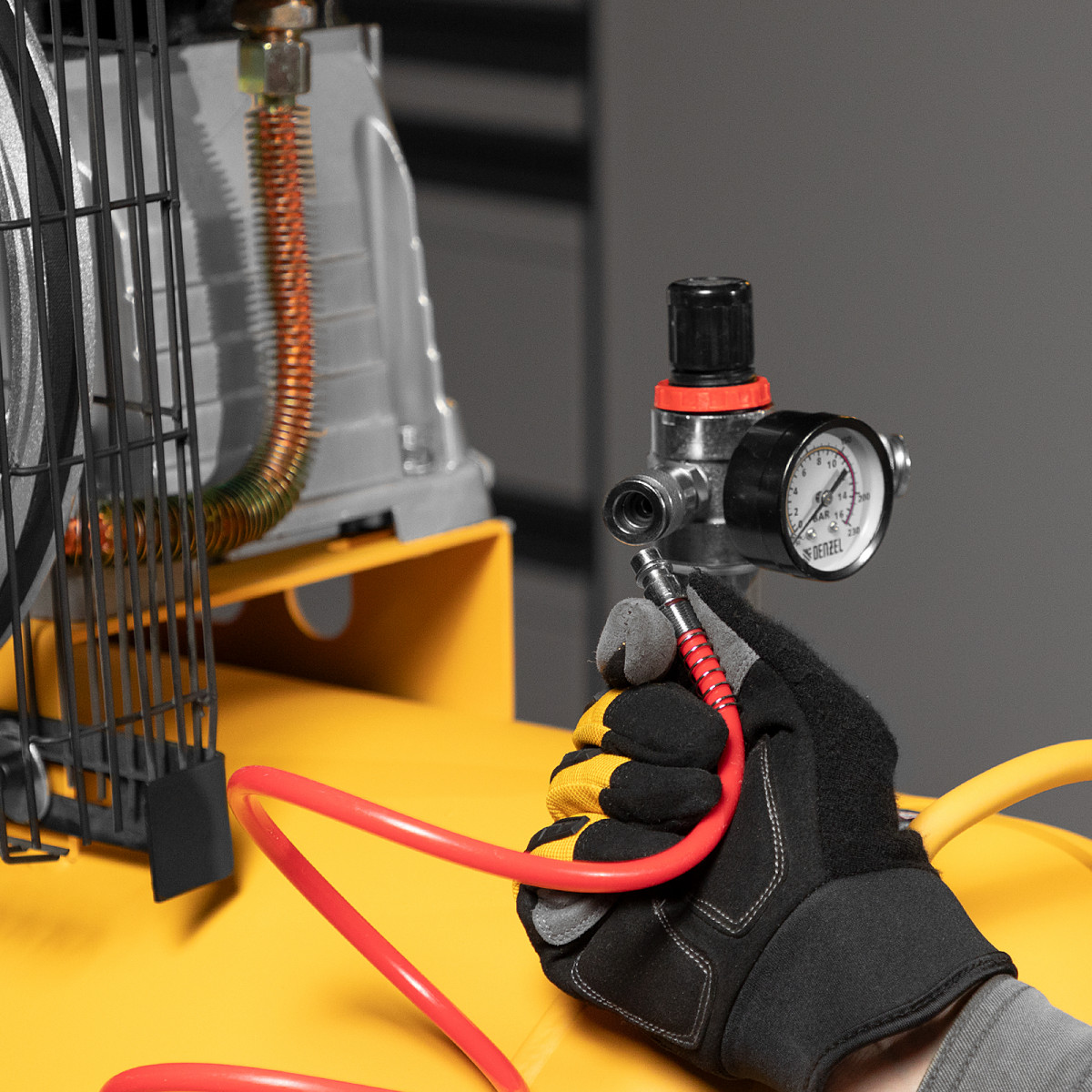 - 2 больших манометра — мастеру удобно отслеживать давление в ресивере и на выходной магистрали.