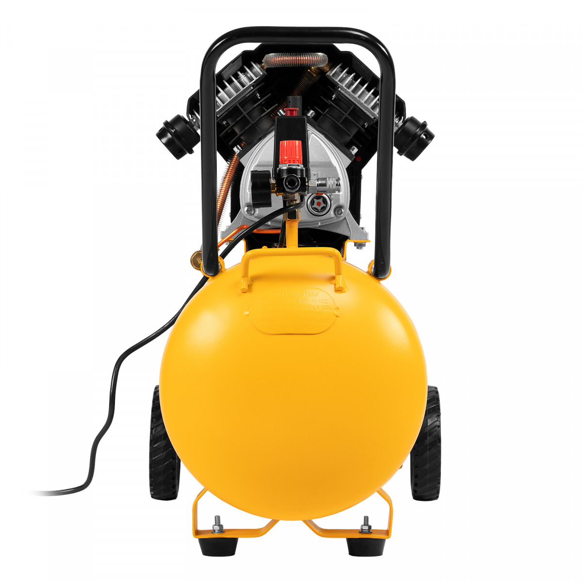 - Мобильность — большие колеса и П-образная ручка позволяют легко перемещать компрессор по рабочей площадке.