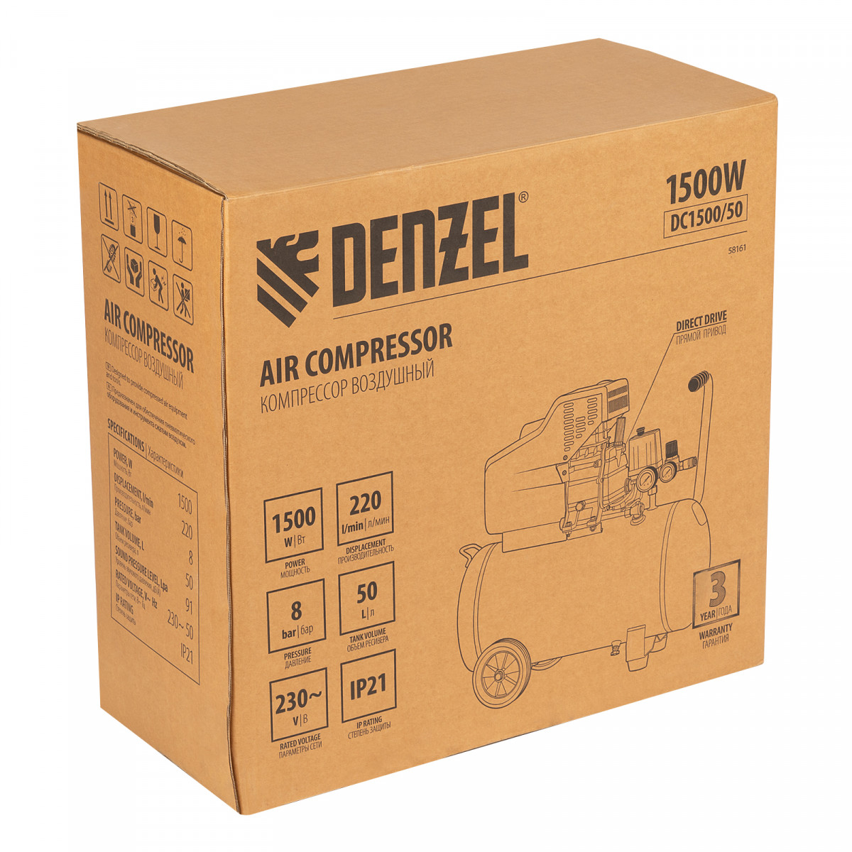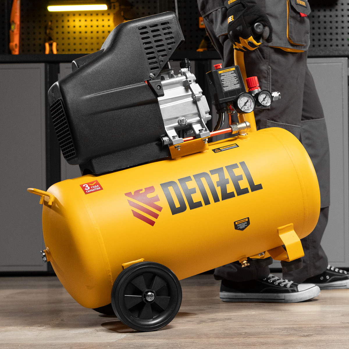Воздушный компрессор с прямым приводом Denzel DC1500/50 58161 мощностью 1,5 кВт и производительностью 220 л/мин, с объемом ресивера 50 л, используется для подачи сжатого воздуха к пневмоинструменту, например, пневмогайковерту, пневмодрели, пневмостеплеру, пневмозубилу. Благодаря использованию смазочного масла, которое снижает износ деталей, компрессор выдерживает длительную работу и подходит для профессионального применения в автомастерской, гараже или на строительной площадке.