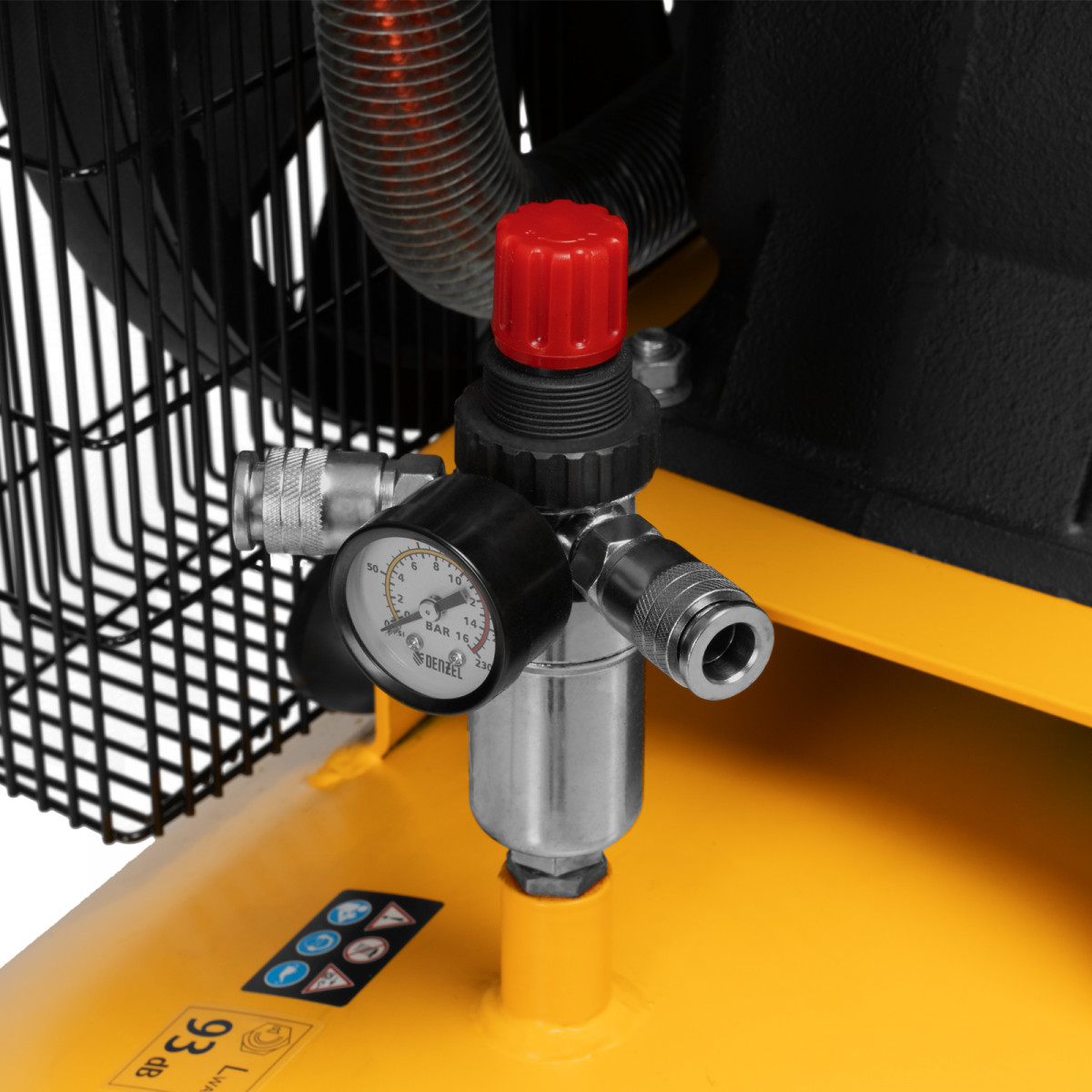 - Удобный контроль давления в ресивере и пневмомагистрали — компрессор оснащен двумя механическими манометрами.