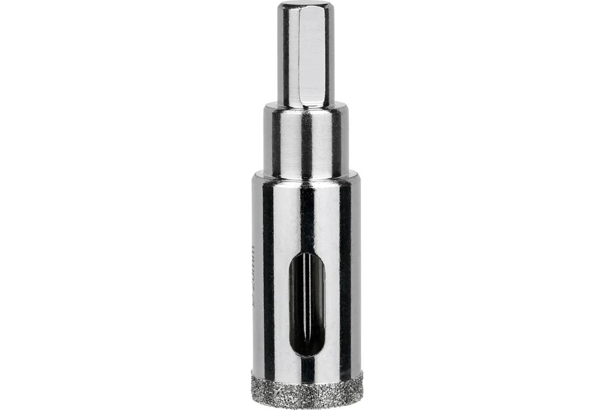 Коронка алмазная по керамограниту 16 мм с центрирующим сверлом применяется для эффективного сверления керамогранита, плитки, стекла. Коронка изготовлена из прочной углеродистой стали, выдерживающей значительные механические нагрузки, и покрыта коррозионностойким покрытием, защищающим коронку от ржавчины и продлевающим срок ее службы. В качестве режущего материала используется двухрядный слой высококонцентрированного синтетического алмаза, нанесенного на режущую кромку коронки.Коронка имеет специальный трехгранный хвостовик, гарантирующий надежное крепление в патроне используемого для сверления инструмента, и защиту от прокручивания.Для надежной фиксации коронки во время сверления и недопущения сдвигов – предусмотрено центрирующее сверло с твердосплавным наконечником. При необходимости изготовления отверстий без использования центрирующего сверла (например, при работе с направляющим кондуктор