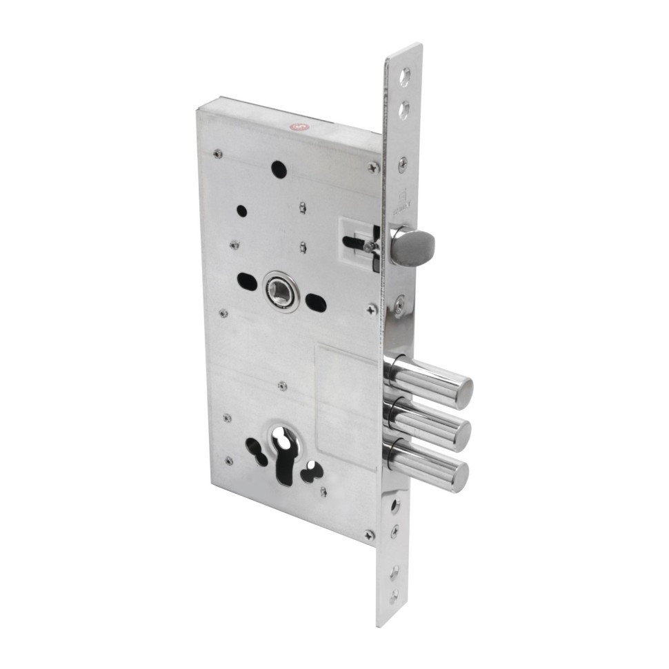 Корпус врезного цилиндрового замка Булат с тремя ригелями и защелкой предназначен для установки во входные и технические металлические двери. Стальной оцинкованный корпус. Универсальная реверсивная защелка, подходит для левых и правых дверей. Отверстия под стяжные винты. Бэксет - 60 мм. Выход ригелей- 36 мм. Диаметр ригелей -16 мм. Открывание-3 полуоборота. В комплект входят: крепежная фурнитура. Цвет лицевой планки - хром.