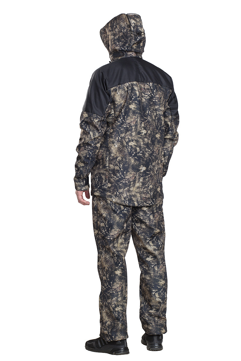 Удобный мужской костюм для активного отдыха на природе. Из современной трехслойной ткани ПОНЖИ (плащовка+ прессовка+ флис). Ткань прочная и дышащая, с водоотталкивающим покрытием, быстро сохнет и обеспечивает воздухообмен. На плечах накладки из ткани повышенной прочности и влаго-ветрозащиты - кошачий глаз. В этой куртке вы будете чувствовать себя защищенным от непогоды. Куртка на молнии удлиненная сзади с четырьмя карманами в рельефах, и утяжками по низу изделия удобно сядет по фигуре. Капюшон с регулировкой по объему и глубине зищитит лицо от влаги и ветра. Брюки сзади с небольшой спинкой для защиты от холода.