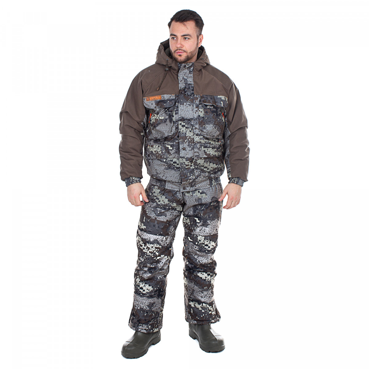 Куртка утепленная с центральной застежкой на «молнию». Спинка и полочки с кокетками из отделочной ткани. На полочках нагрудные накладные карманы, вход в карман сбоку с застежкой на «молнию». Нижние карманы накладные с клапаном. Рукав реглан 3х шовный. Средняя часть рукава выполнена из отделочной ткани. По низу рукава притачная манжета со вставкой. Низ куртки на притачном поясе c резинкой. Центральная молния закрыта ветрозащитным клапаном, застегивающимся на кнопки. Капюшон притачной 2х шовный, лицевой срез стягивается резинкой. На подкладке левой полочки прорезной карман с «молнией». Полукомбинезон прямого силуэта с центральной застежкой на «молнию», с нагрудными прорезными карманами застегивающимися на «молнию», с боковыми карманами с наклонным входом. Бретели регулируются с помощью эластичной тесьмы, фастексов и регулирующих пряжек. По низу ширина штанин регулируется с помощью «молнии» и паты на контактной ленте.