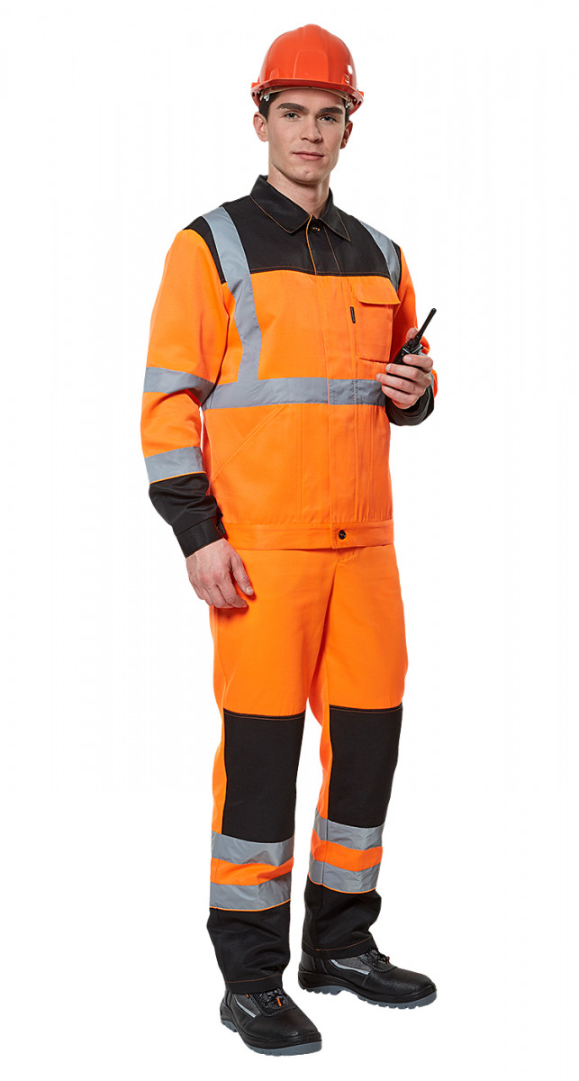 Куртка прямого силуэта с притачным поясом, с центральной потайной застежкой на пуговицы. Перед с кокетками из отделочной ткани. На левой части расположен верхний объемный карман с клапаном для средств связи. По низу переда куртки - накладные карманы с наклонной линией входа. Спинка с кокеткой из отделочной ткани. На притачном поясе со стороны спинки расположены хлястики с застежкой на петлю и пуговицы для регулировки объема. Рукава втачные. Низ рукавов из отделочной ткани, с манжетами с застежкой на петлю и пуговицу. Воротник отложной из отделочной ткани.
