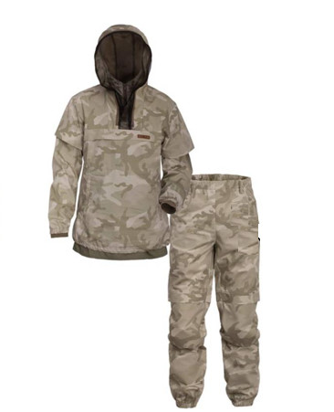 Высокую степень защиты от укусов клещей и других кровососущих насекомых обеспечивает защита механическая Костюм состоит из куртки и брюк. Свободный крой учитывает особенности женской фигуры. Анатомический крой изделия обеспечивается за счет ластовиц в проймах рукавов и в области шагового шва брюк. Куртка типа «анорак». Горизонтальные складки-ловушки на полочке, спинке, брюках, рукавах куртки преграждают движение насекомого вверх. В нижней части куртки подкладка, которая заправляется в брюки. Пояс и низ брюк, низ куртки и рукавов собраны эластичной резинкой.