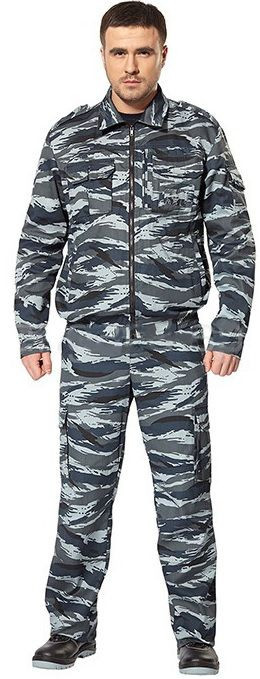 Состоит из куртки и брюк. Куртка прямого силуэта с центральной застежкой на молнию, отложным воротником. Оснащен нагрудными накладными карманами с клапанами на липучках для средств связи, имеется карман на молнии для документов. Поверх кармана прозрачное окно для бейджа. На рукаве накладной карман с клапаном.