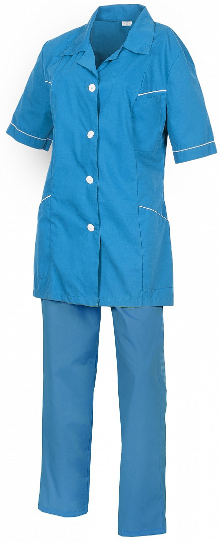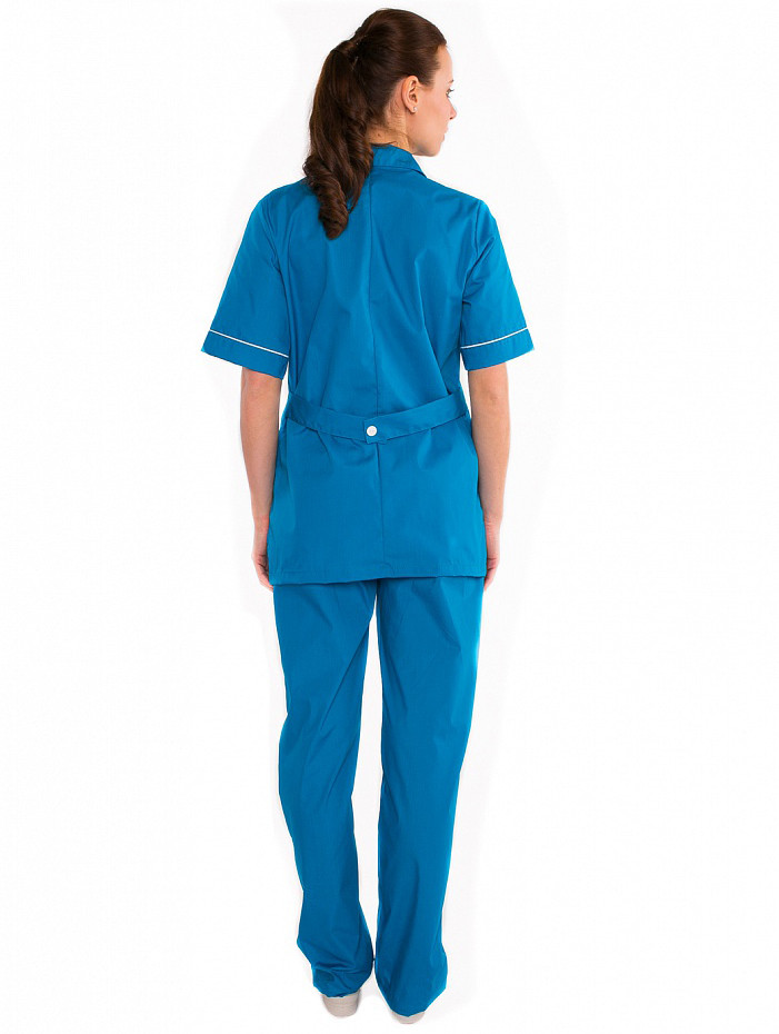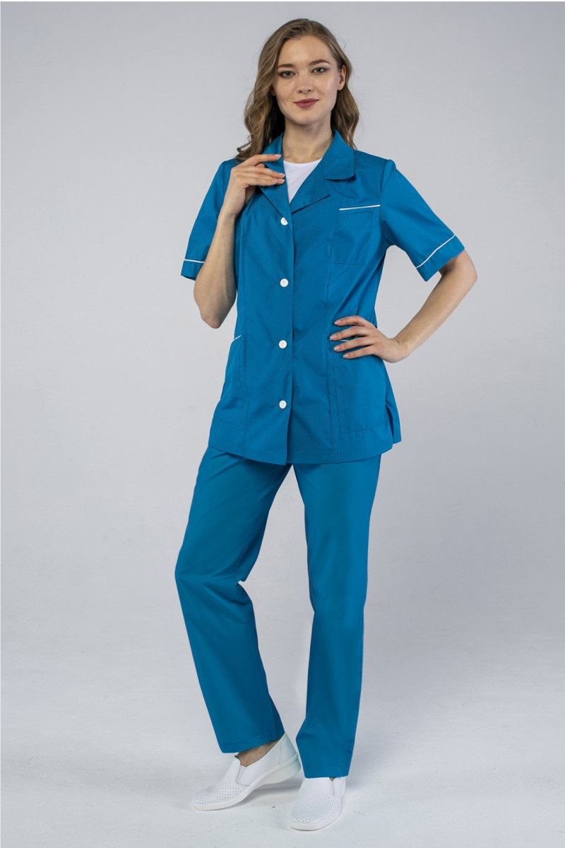 Классическое строение костюма и приятный цвет морской волны сразу же обращают на себя внимание. Костюм состоит из цветной куртки и брюк. Куртка на пуговицах и кокетке, коротким рукавом, тремя накладными карманами. Карманы, рукава, кокетка декорируются контрастным кантом. Брюки на резинке. Ткань смесовая, состав 65% пл., 35% хл. плотность 120г/ м.