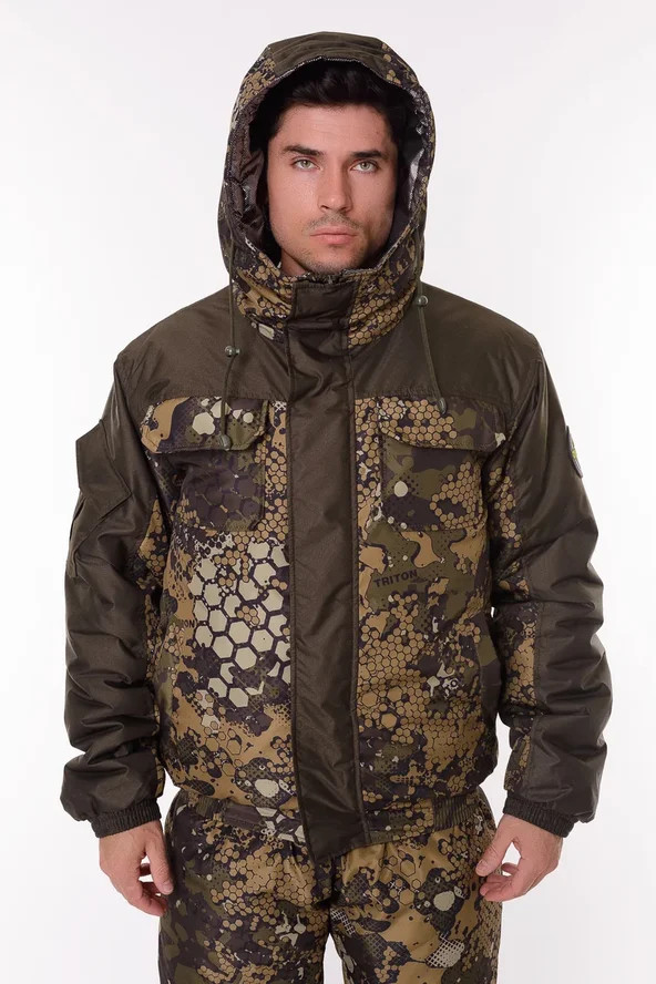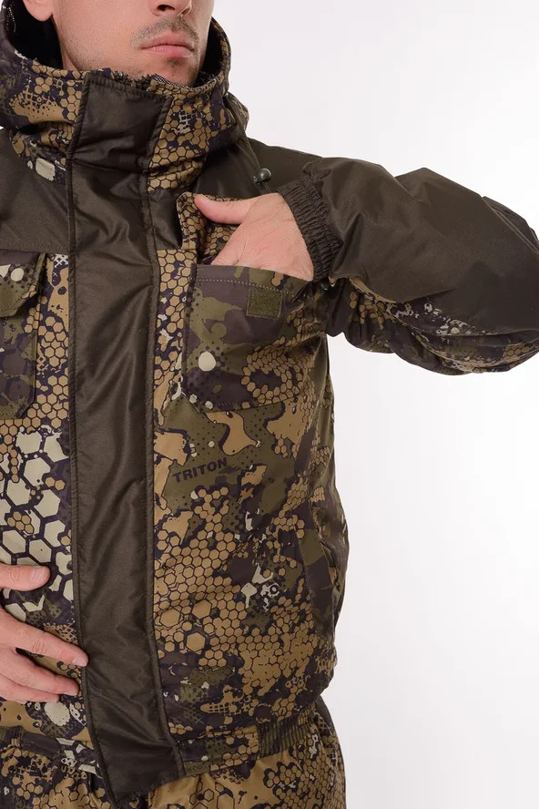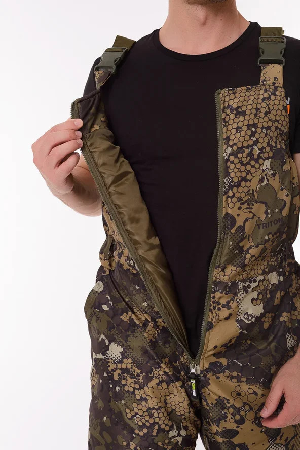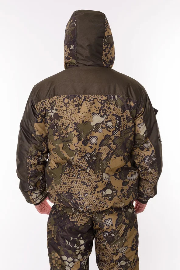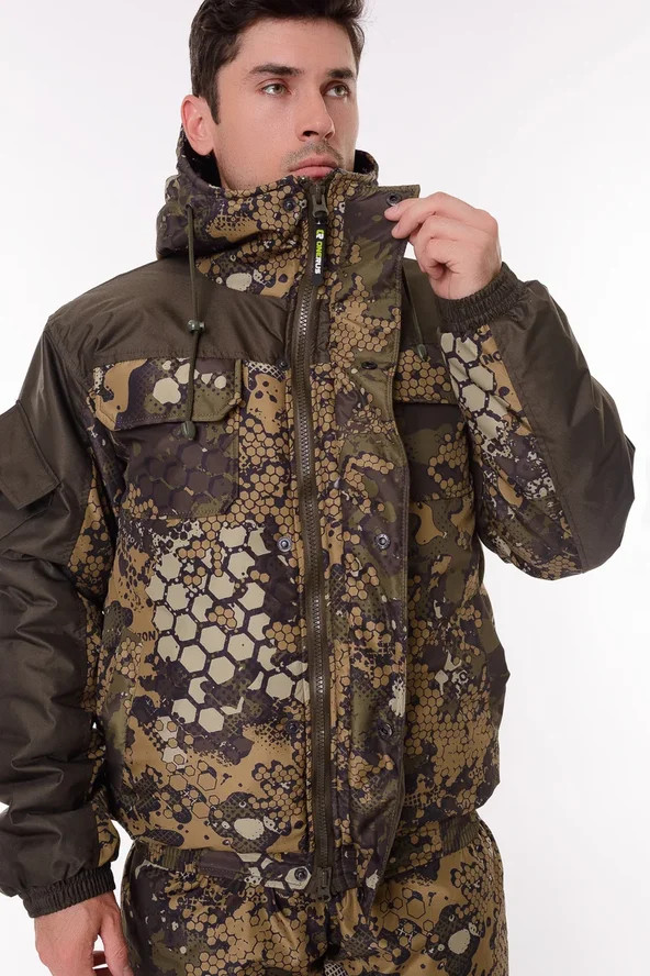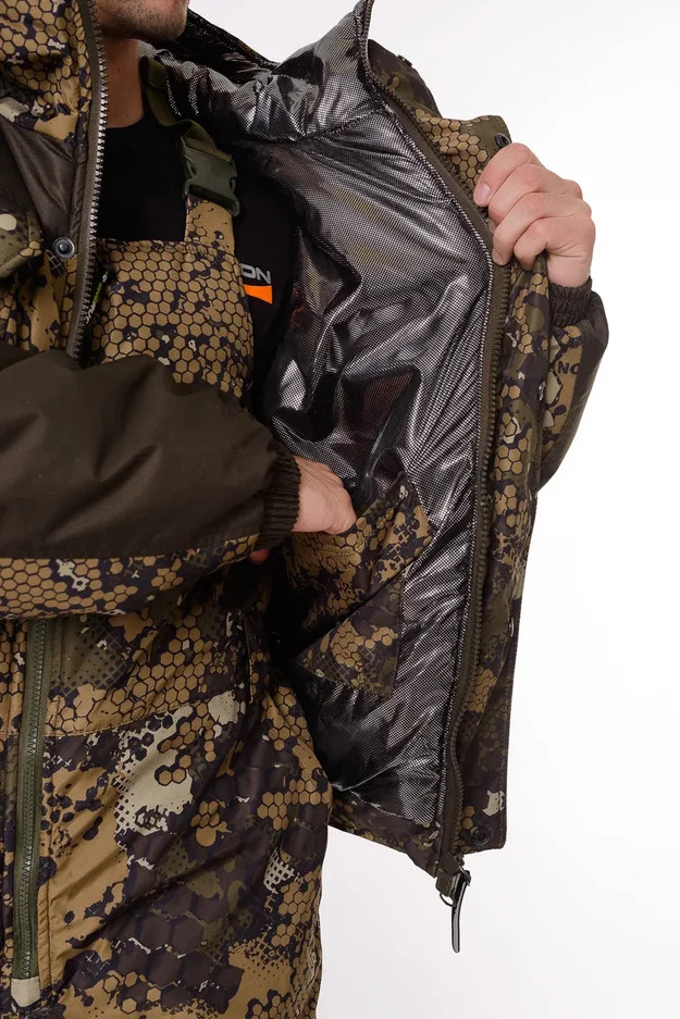 Основная ткань Дюспа Утеплитель Синтепон 350 г/м² Подклад фольгированный Мембрана 3000/3000 Съемный капюшон Капюшон и воротник отделаны флисом Трикотажные манжеты на рукавах + утяжка липа Молнии расширители по низу брюк + планка на липе Утяжка по низу куртки Лямки подтяжки типа горка, с перекрестием в области лопаток