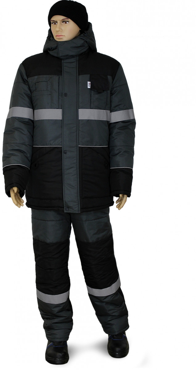 Костюм состоит из куртки и полукомбинезона. Куртка со светоотражающими полосами и кантом, с центральной застежкой на молнию, ветрозащитным клапаном на текстильную застежку с чередованием кнопок и внутреннюю планку с уголком для защиты подбородочной части от молнии. Воротник стойка, с внутренней стороны флис, съемный утепленный капюшон. На правой полочке нагрудный карман для бейджа. Рукава с внутренними полушерстяными манжетами. Полукомбинезон со светоотражающими полосами , с центральной застежкой на молнию и планку на текстильную застежку, на регулируемых по длине бретелях. На правой передней половинке нагрудный карман для сотового телефона. На спинке, по линии талии в области боковых швов, кулиса.