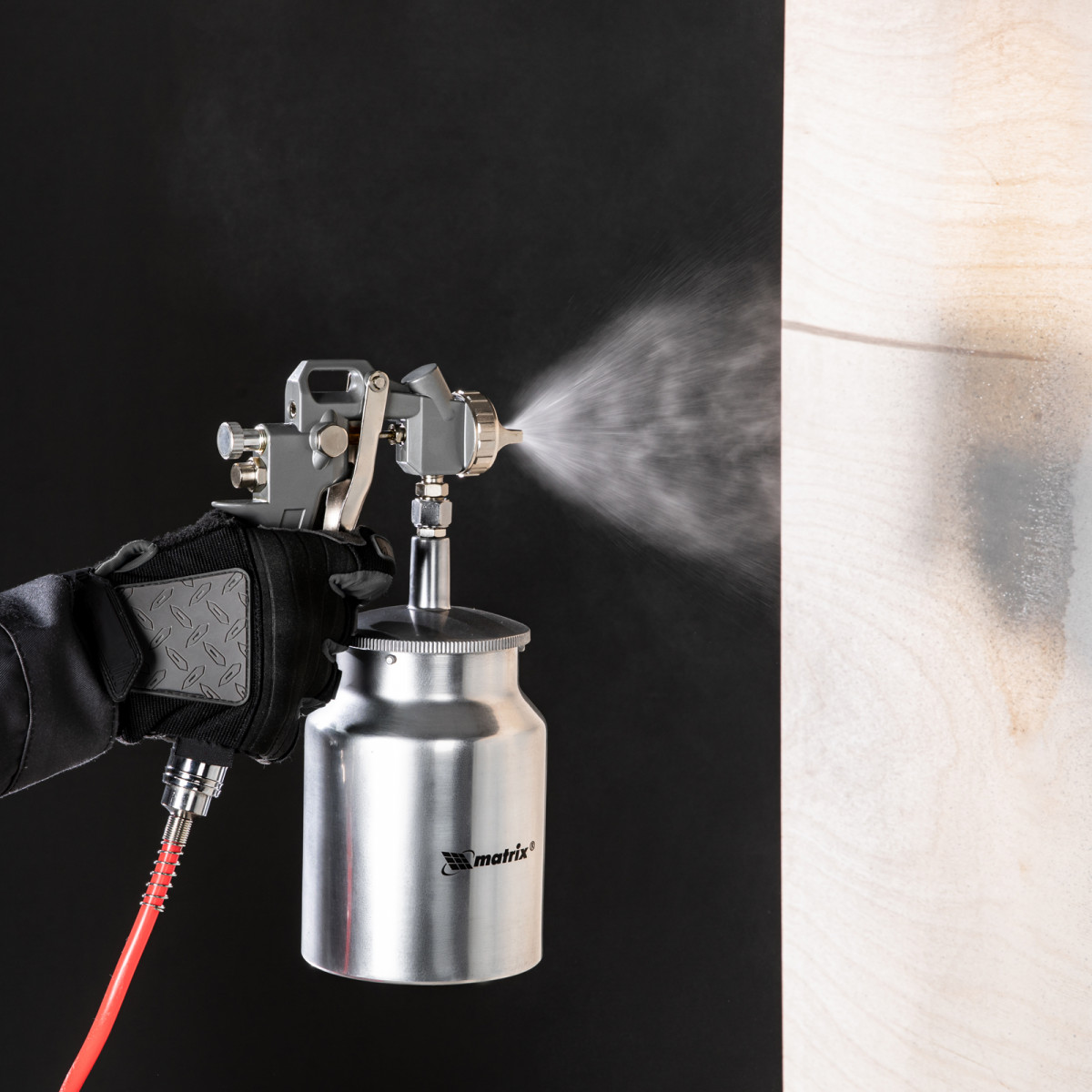 Пневматический краскораспылитель Matrix 57316 с нижним бачком объемом 1,0 л и соплами диаметром 1,2, 1,5 и 1,8 мм используется для окрашивания металлических, деревянных, керамических и пластмассовых поверхностей. Благодаря сменным соплам краскораспылитель может работать с различными по густоте составами: лаком, шпаклевкой, краской. Он пригодится на стройке, в автомастерской и на мебельном производстве.