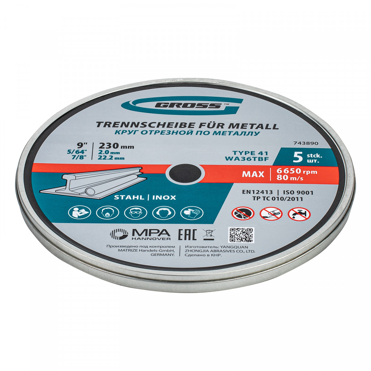 Круг отрезной по металлу, 230 х 2,0 х 22,2 мм, WA36TBF, в метал.банке, 5 шт. Gross