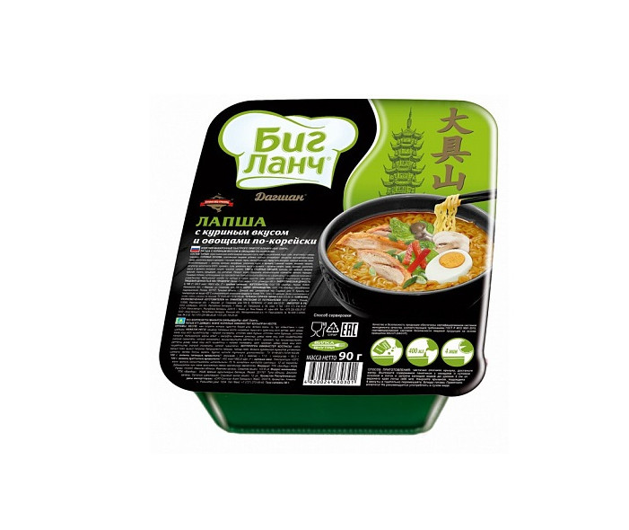 Лапша быстрого приготовления с куриным вкусом и овощами ПО-КОРЕЙСКИ Дагшан, от торговой марки "Биг ланч",позволить вам сытно, качественно , быстро утолить голод и получить удовольствие от еды.