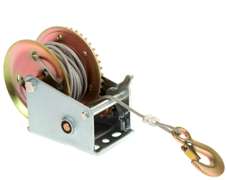 Канатная лебедка с храповым тормозом (0.55 т, канат 10 м) TOPEX 97X085 оснащается крюком, который крепится к канату через специальную петлю. Храповый механизм значительно упрощает подъем грузов. Использование лебедки допускается в домашних условиях при перемещении объектов весом до 550 килограммов