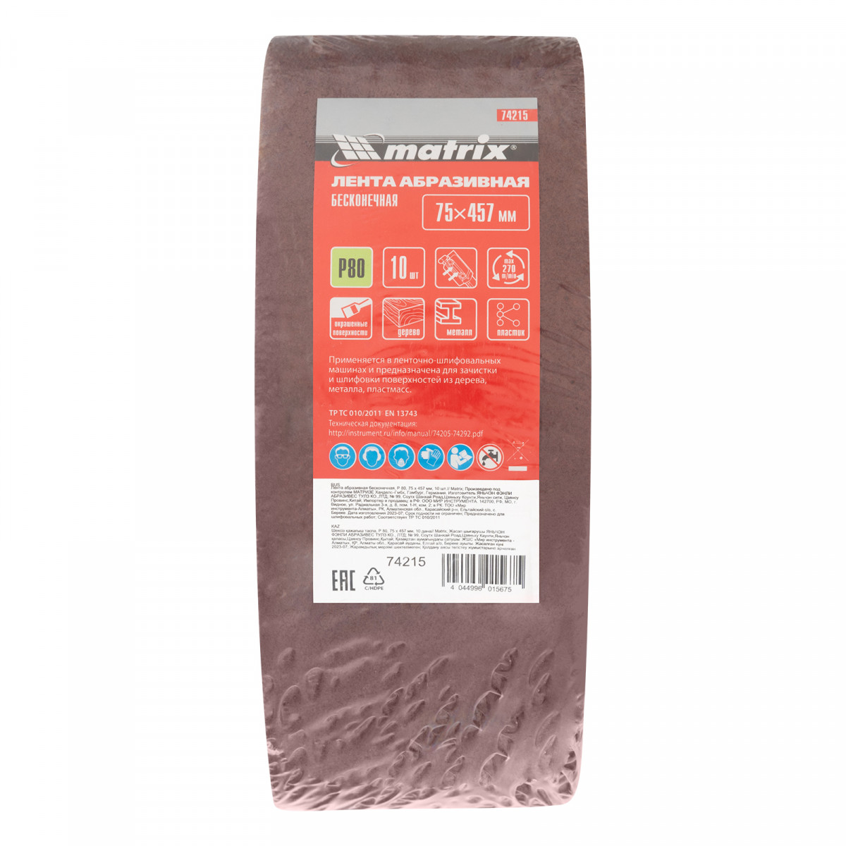 Бесконечная абразивная лента Matrix 74215 с зернистостью P 80, 10 шт. в упаковке, устанавливается на ленточную шлифовальную машину, совместимую со сменными элементами размером 75 х 457 мм. Применяется для первичной обработки деревянных и металлических поверхностей, снятия лака, краски, ржавчины, заусенцев и т. д.