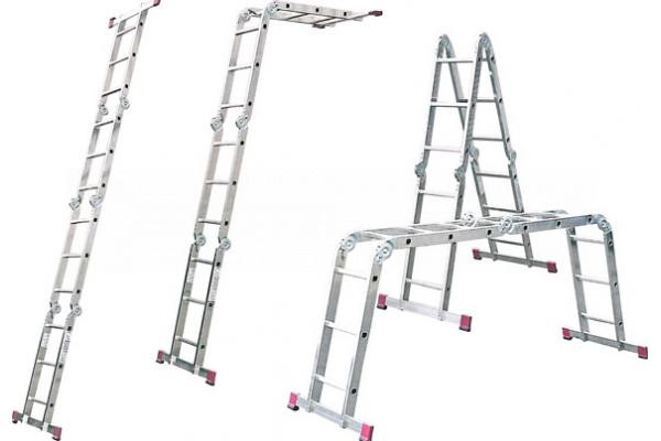 Eниверсальная лестница из четырех частей для профессионального и полупрофессионального использования. Отличительной особенностью лестницы — трансформера является широта возможных позиций, в которых её можно использовать, что даёт гибкость в работе, а также компактность, что позволяет легко перемещать и транспортировать эту лестницу. Направляющие и ступени имеют дополнительные ребра жёсткости.Траверса крепится к основанию лестницы прочными стальными болтами, что позволяет её снимать и крепить обратно.