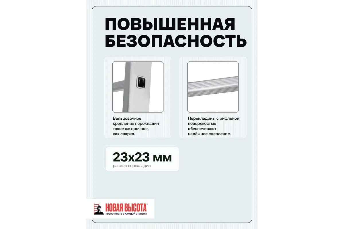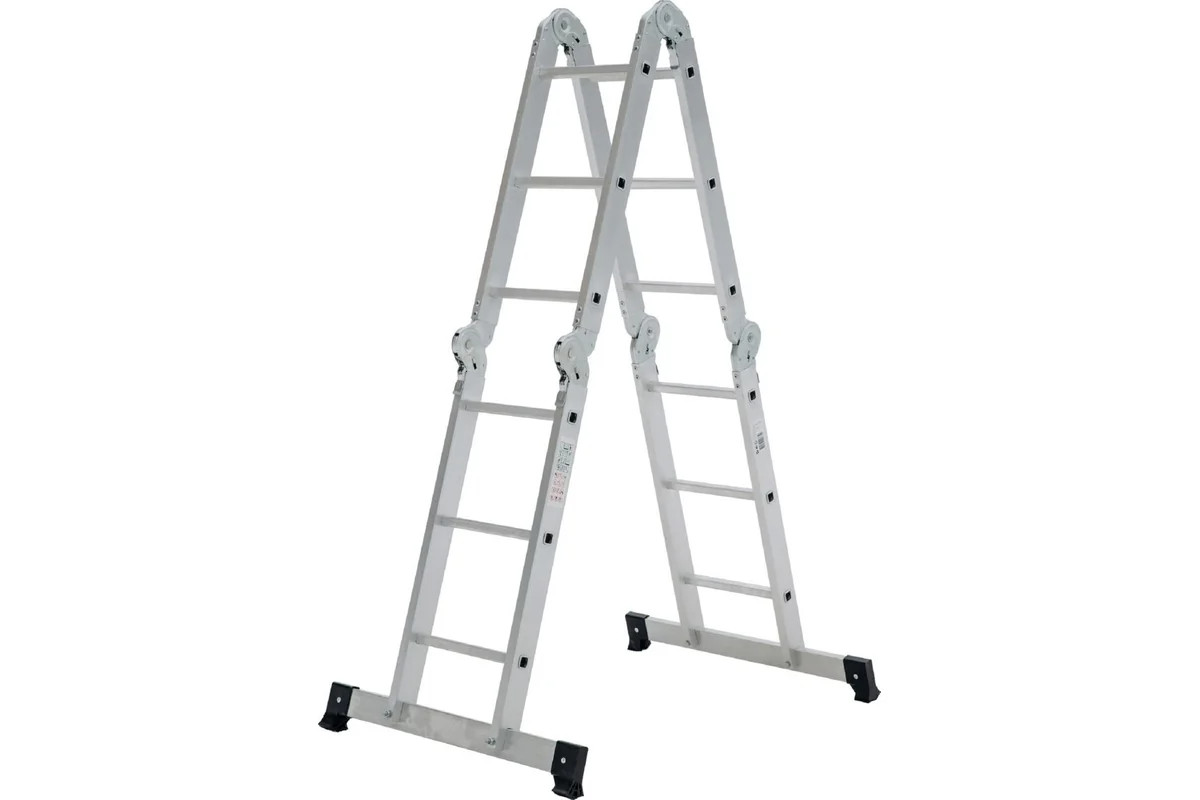 Четырехсекционная лестница-трансформер Новая Высота 4х3 ступени отличается универсальностью, компактностью при хранении, устойчивостью. Легко преобразуется в помост-платформу, стремянку, приставную лестницу, лестницу с выносом. Оснащена стойками с дополнительным усилением в наиболее нагруженных местах для повышения жесткости. Благодаря многократной развальцовке в соединении ступеней со стойками изделие имеет долгий срок службы.