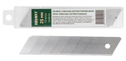 Лезвия сменные сегментированные 10 шт, 25 мм ВОЛАТ 24000-25 используются как расходный материал для пистолетного ножа 24103. Подходят для бумаги, картона, обоев, линолеума, кожи. Изготовлены из углеродистой инструментальной стали.Лезвия сменные для ножей 25мм 6 сегм (10шт) ВОЛАТ.