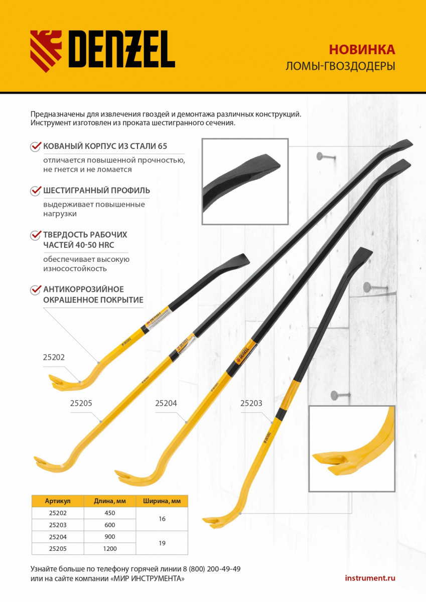Лом-гвоздодер, 600 мм, шестигранный 16 мм, окрашенный, сталь 65 Denzel