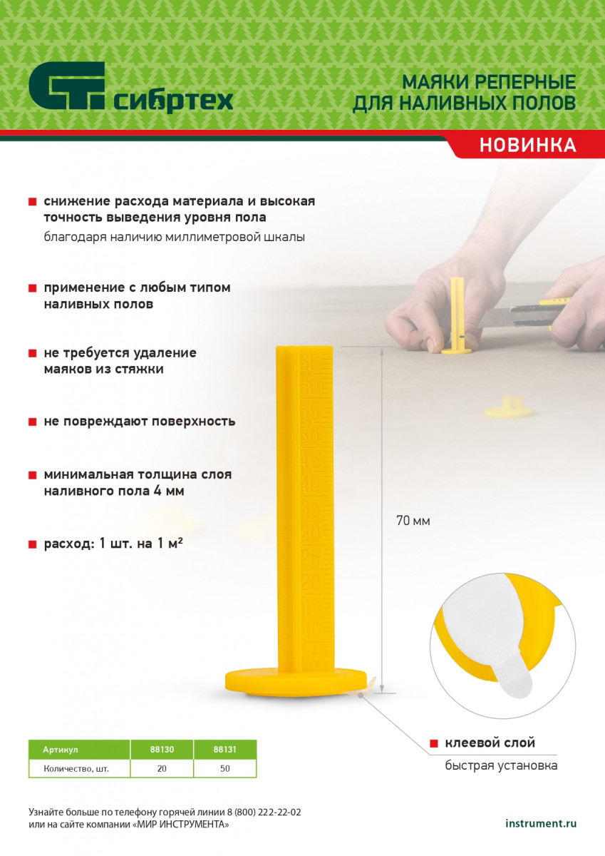 Реперные маяки Сибртех 88131 с клеевым слоем, 50 шт. в упаковке, предназначены для контроля высоты заливки наливных полов. Обеспечивают высокую точность выведения уровня пола, позволяют получить идеально ровное покрытие, избежав лишнего расхода строительной смеси. На маяки нанесена шкала высоты до 70 мм, минимальная толщина слоя наливного пола составляет 4 мм. Набор пригодится при проведении строительных и ремонтных работ.