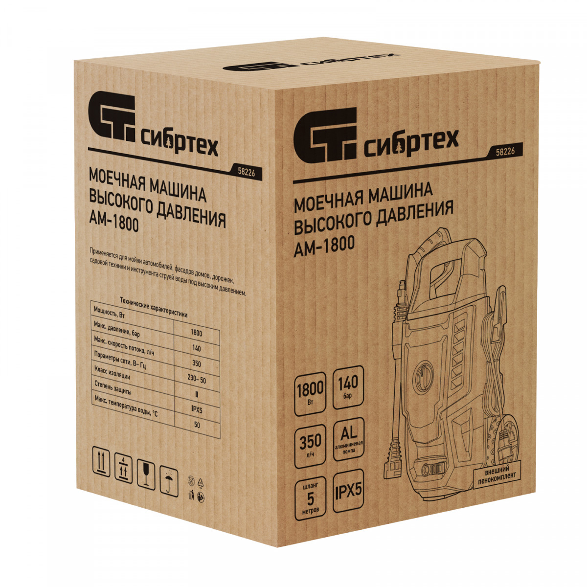 Колесная моечная машина высокого давления Сибртех AM-1800 58226 мощностью 1800 Вт и производительностью 350 л/ч подает струю воды 140 бар. Позволяет быстро очистить садовые дорожки, забор, стены строений, садовый инвентарь, уличную мебель, кузов автомобиля. Машина подключается к водопроводу, а также способна работать в режиме самовсасывания — в этом случае в качестве источника воды можно использовать любую емкость. Устройство будет полезно владельцам дачных участков.