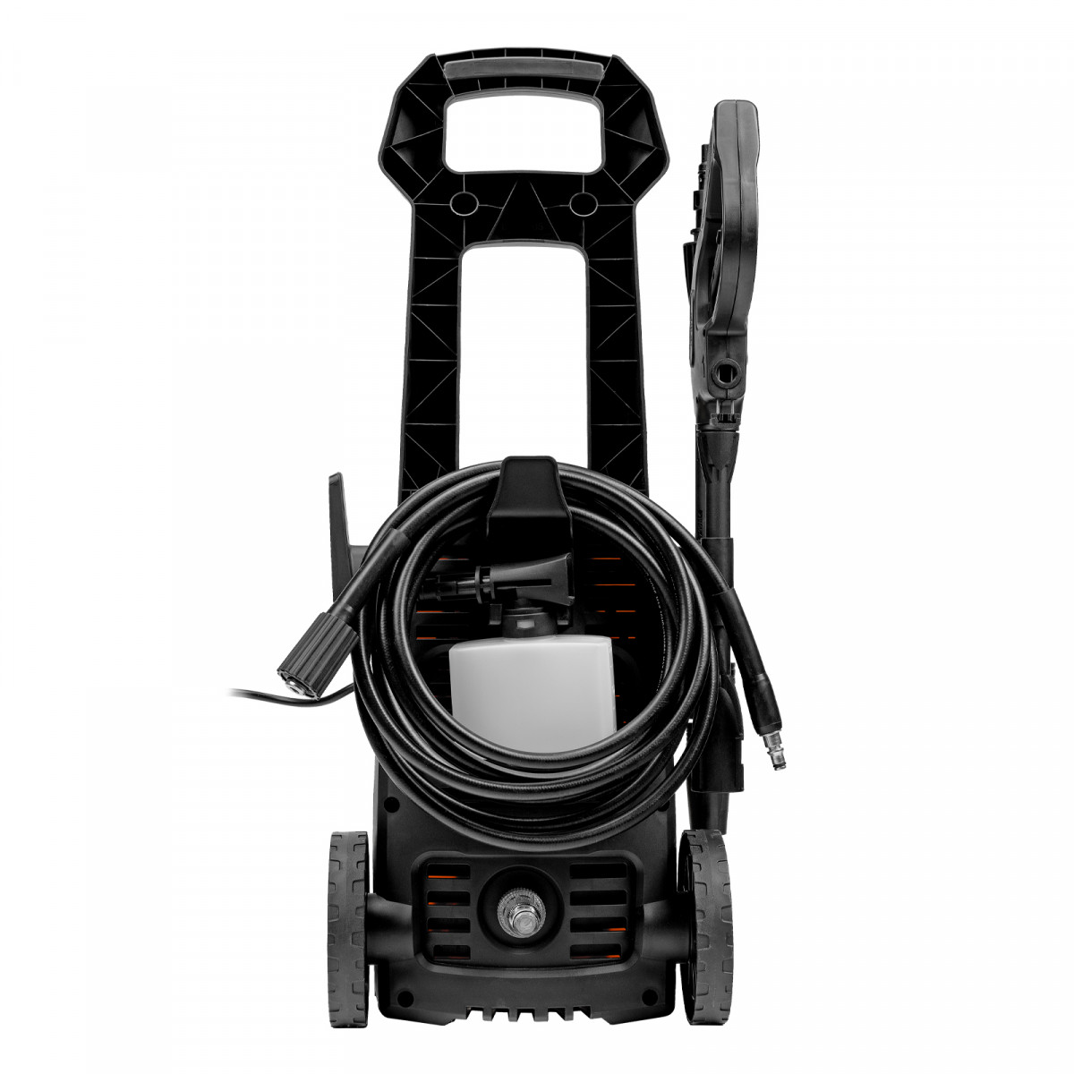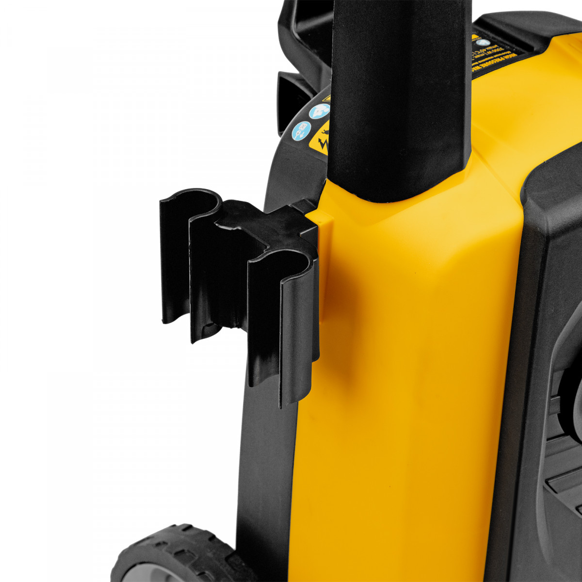 • Продуманная конструкция — кронштейны для шнура питания и шланга высокого давления, а также держатель для пистолета обеспечивают удобство хранения.