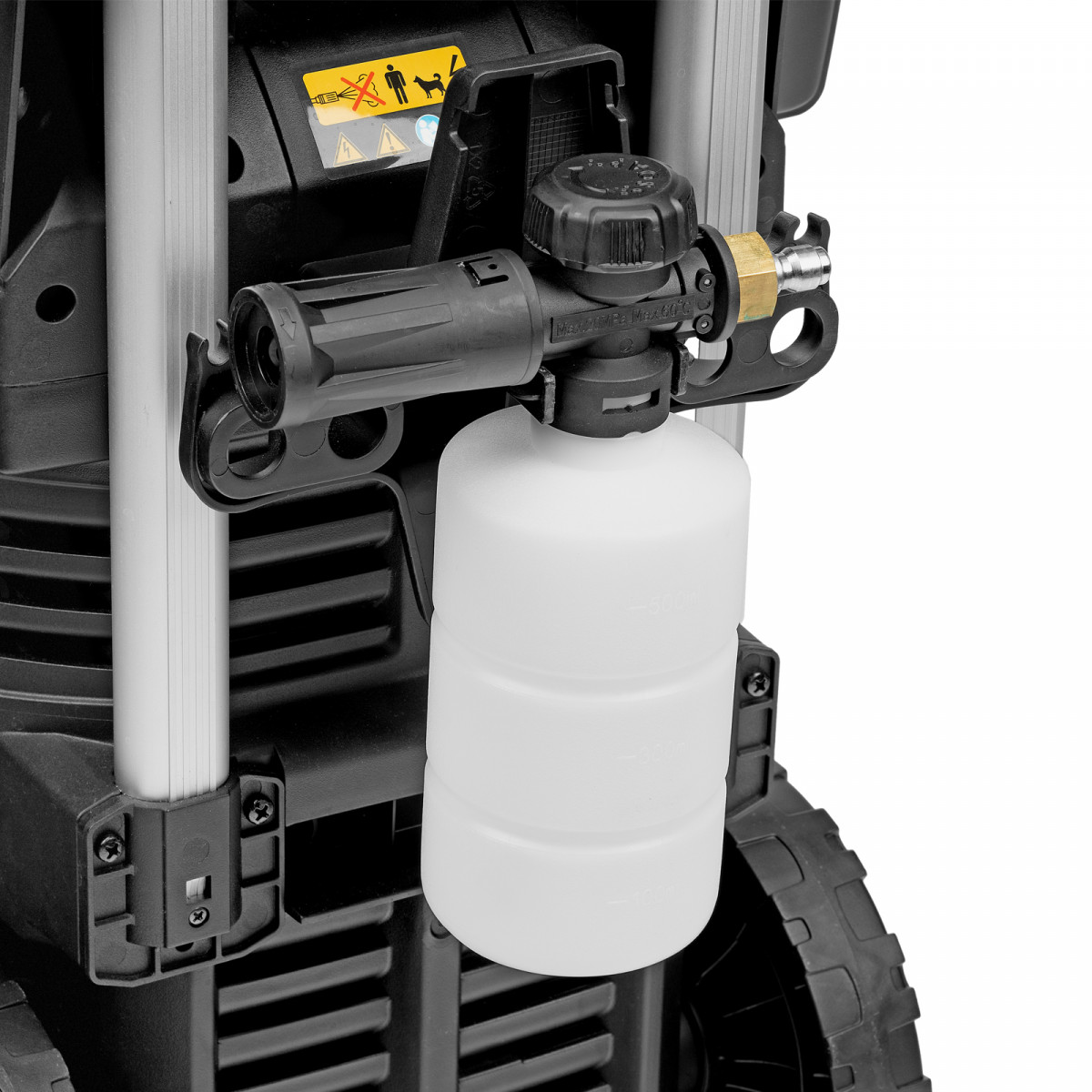 - Максимально эффективное очищение — к мойке прилагается внешний пенокомплект с функцией улучшенного пенообразования, быстросъемное крепление позволяет устанавливать его на пистолет одним движением.