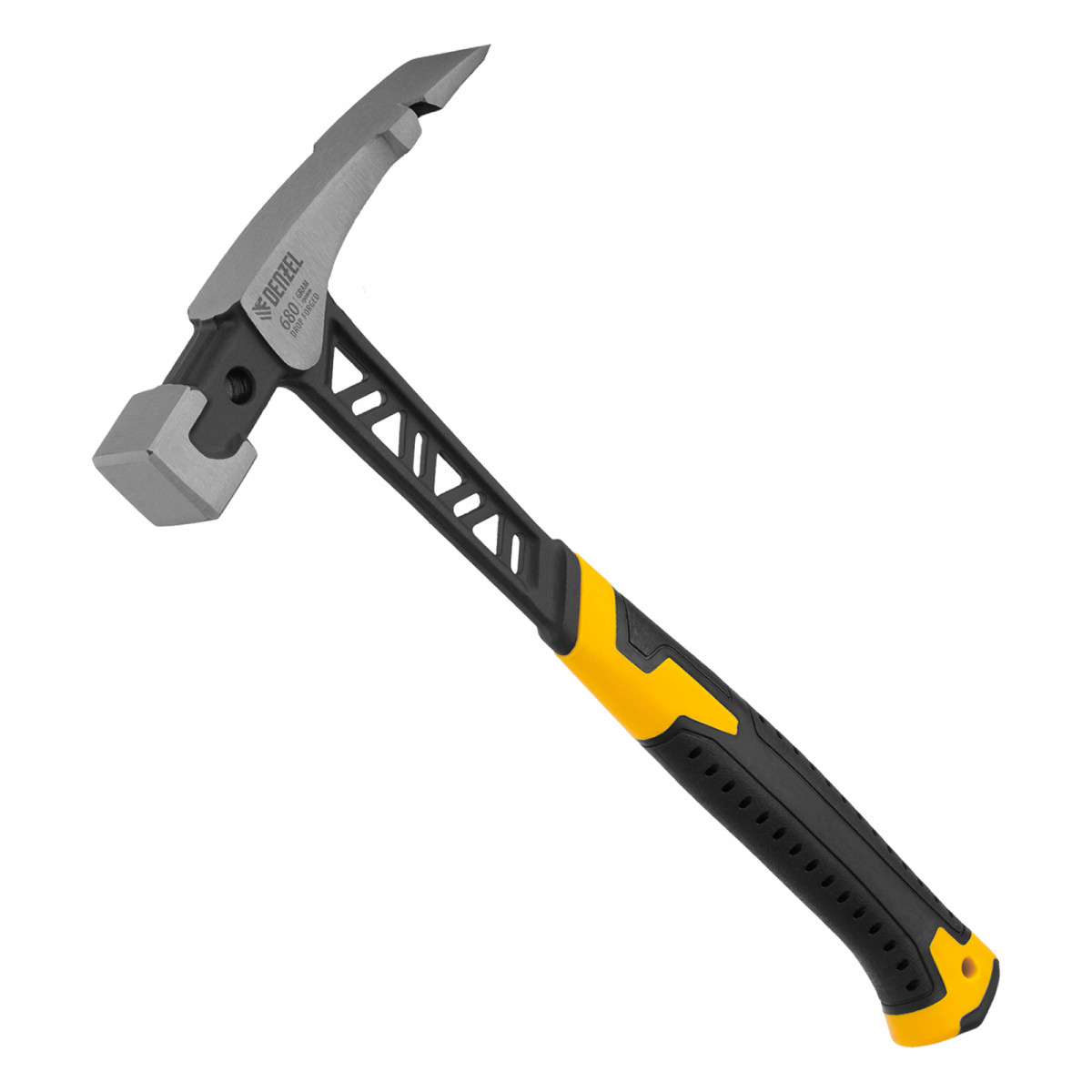 Цельнокованый молоток каменщика Denzel 10633 с бойком весом 680 г, с двухкомпонентной обрезиненной рукояткой, используется для выполнения работ с каменной или кирпичной кладкой. Квадратный боек предназначен для нанесения ударов, а удлиненный заточенный носок — для разрубания камня или кирпича. Гвоздодер применяется для выпрямления небольших гвоздей.