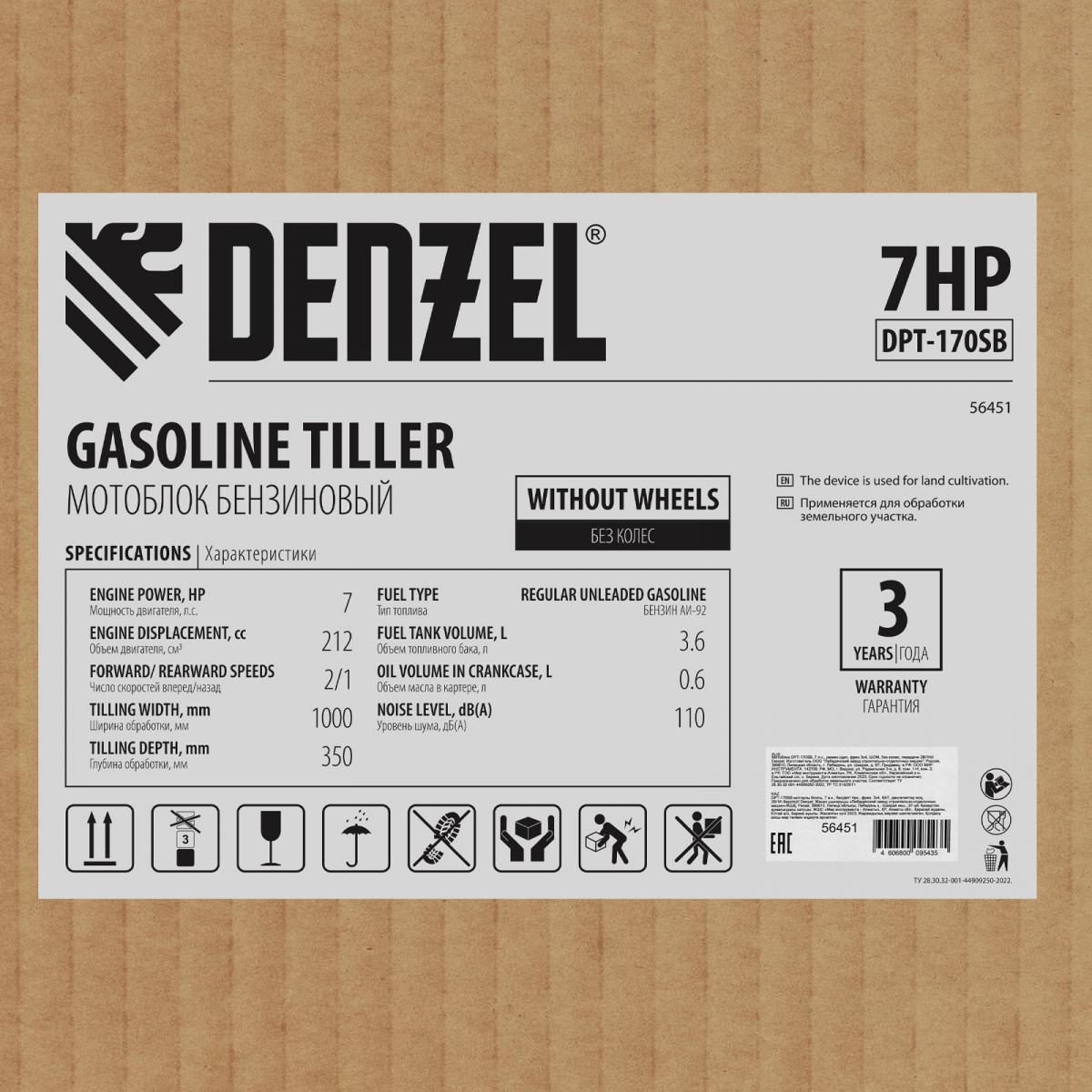 Мотоблок Denzel DPT-170SB 56451 мощностью 7 л. с., с ременным механизмом сцепления, оснащен фрезами 3 х 4, шкивом отбора мощности (ШОМ) и коробкой передач 2В/1Н. Предназначен для выполнения земляных работ: рыхления, вспахивания, прополки и т. д. Разборные фрезы с дополнительными секциями позволяют регулировать ширину обработки до 1 м.,Усиленный шестеренчато-цепной редуктор из алюминия позволяет работать длительное время с большими нагрузками. Благодаря шкиву отбора мощности и кронштейну диаметром 30 мм к мотоблоку можно подключать любое навесное оборудование Denzel, например, плуг, окучник, картофелевыкапыватель, что позволяет сократить расходы на приобретение дополнительной сельскохозяйственной техники. Установка прицепа Denzel 59950 позволяет использовать мотоблок для транспортировки грузов.