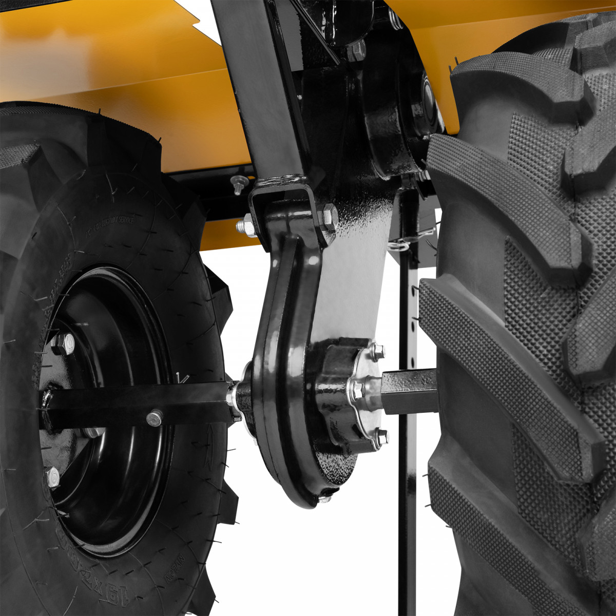 - Повышенная проходимость — мотоблок оснащен тракторными пневматическими колесами.