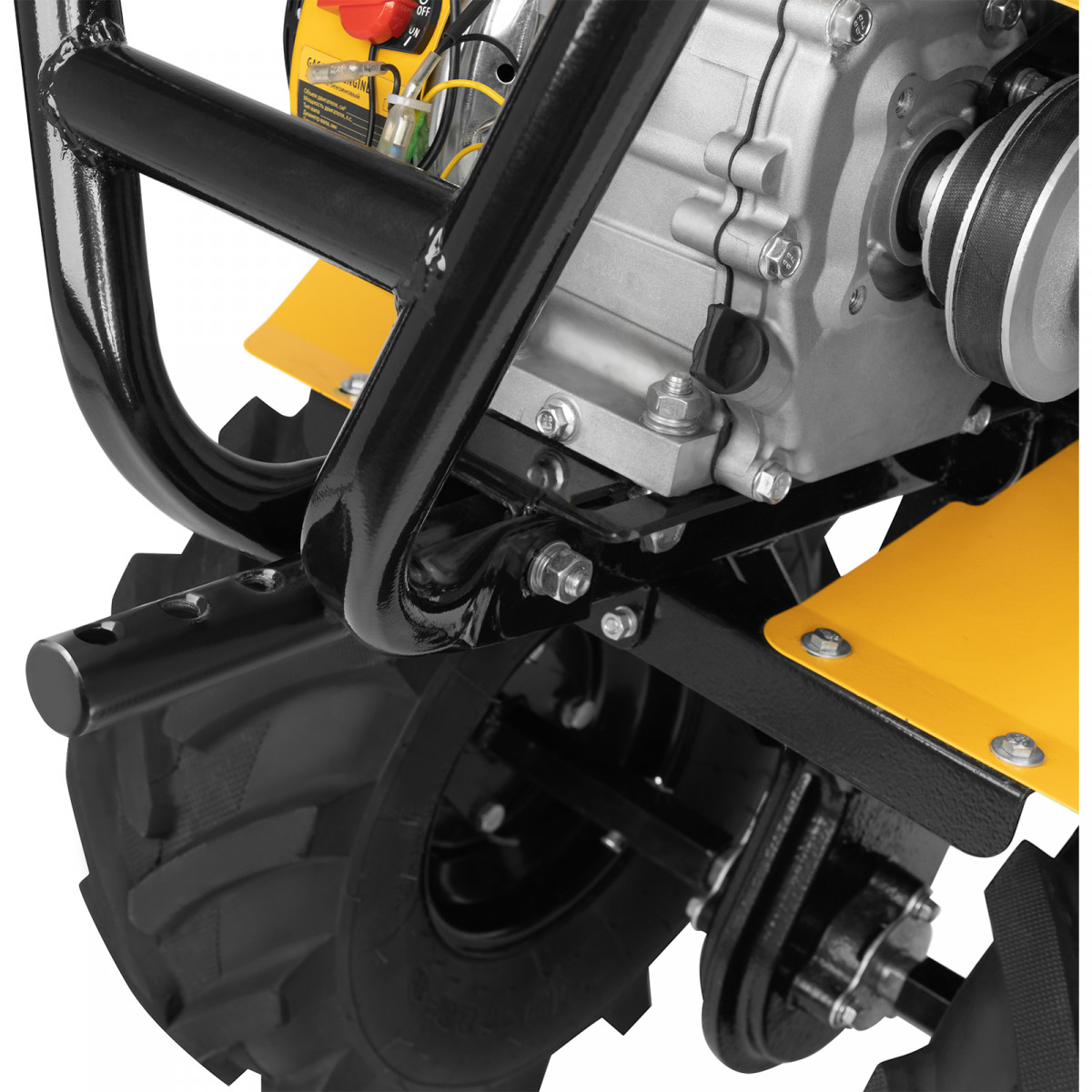 - Усиленная рама — ключевые узлы надежно защищены, мотоблок удобно транспортировать.