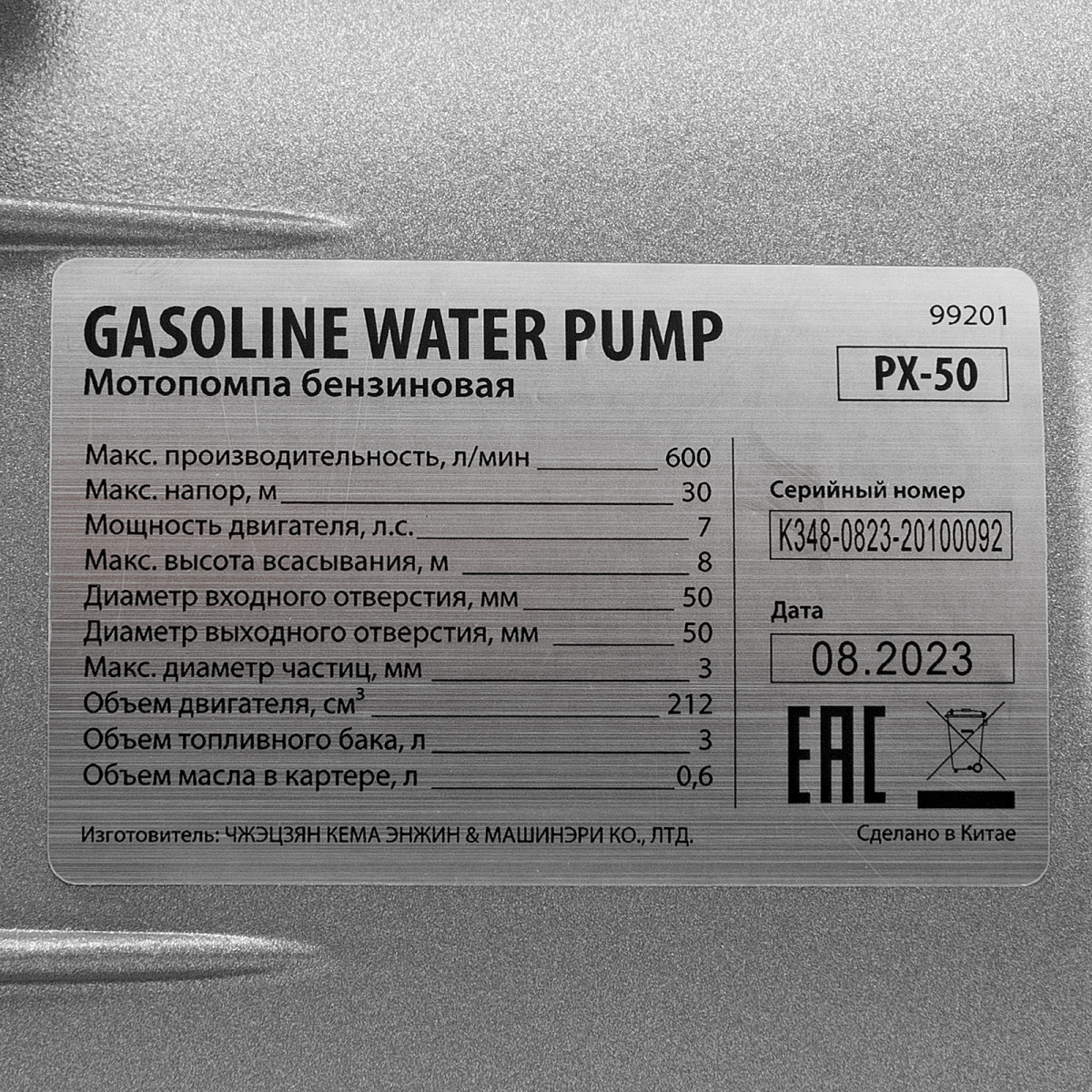 Мотопомпа бензиновая для чистой воды PX-50, 7 л.с, 2", 600 л/мин, глубина 8 м, напор 30 м Denzel