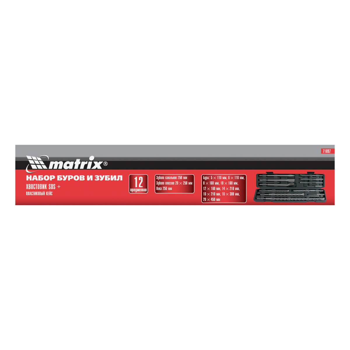 Набор Matrix 71097 включает 9 буров по бетону размером 5-6 х 110 мм, 8-10-12 х 160 мм, 14-16 х 210 мм, 18 х 300 мм, 20 х 450 мм и 3 зубила, которые используются в качестве оснастки на перфораторах с патронами SDS PLUS. Набор предназначен для сверления отверстий в бетоне, кирпиче и камне, а также для удаления старого слоя штукатурки, снятия облицовочной плитки, штробления и демонтажа армированного бетона. Подходит для работы на строительной площадке, пригодится ремонтным бригадам и профессиональным мастерам, также будет полезен в быту.