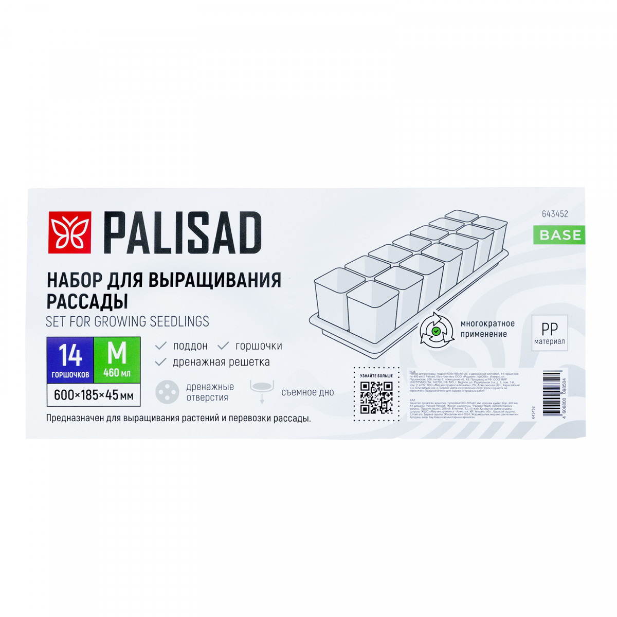 Набор для рассады, поддон 600х185х45 мм, с дренажной системой, 14 горшочков по 460 мл. Palisad