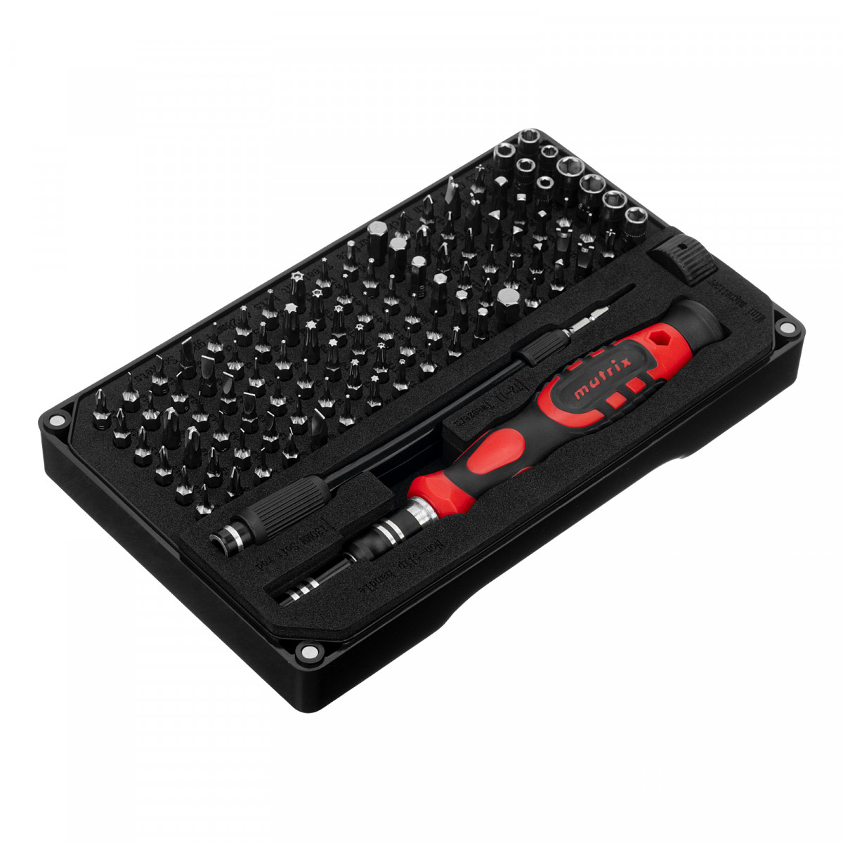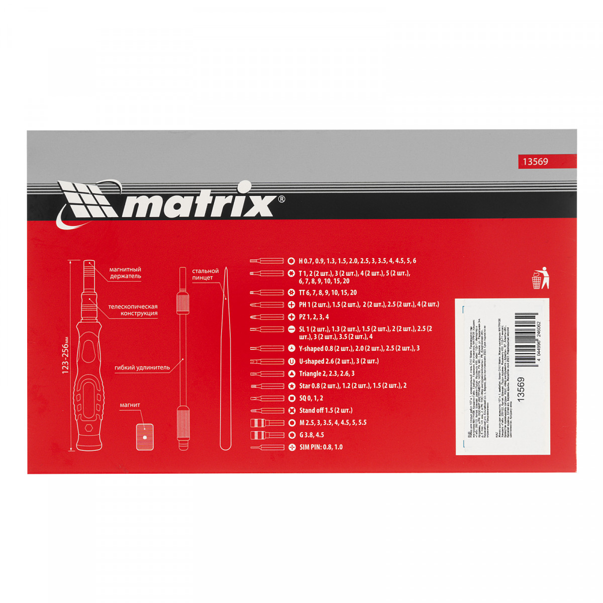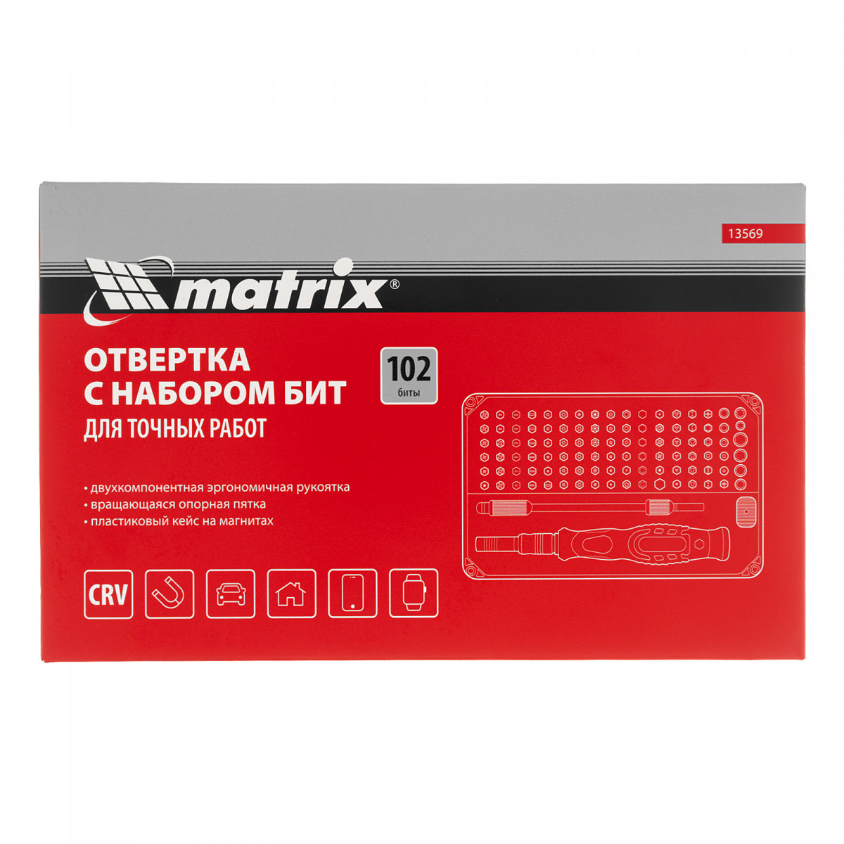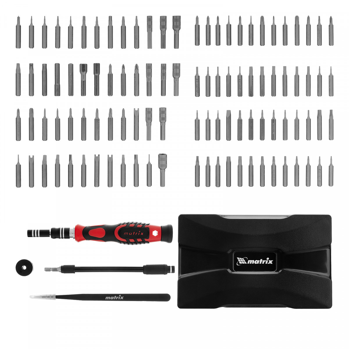 Набор для точных работ Matrix 13569 включает в себя 93 биты, 9 торцевых головок, телескопический и гибкий удлинители, намагничиватель-размагничиватель бит, отвертку и пинцет с защитным колпачком. С его помощью можно отремонтировать очки, игрушки, портативную и бытовую технику и т.д. Выдвижной стержень, гибкий удлинитель и пинцет позволяют работать с мелкими деталями в углублениях и труднодоступных местах.