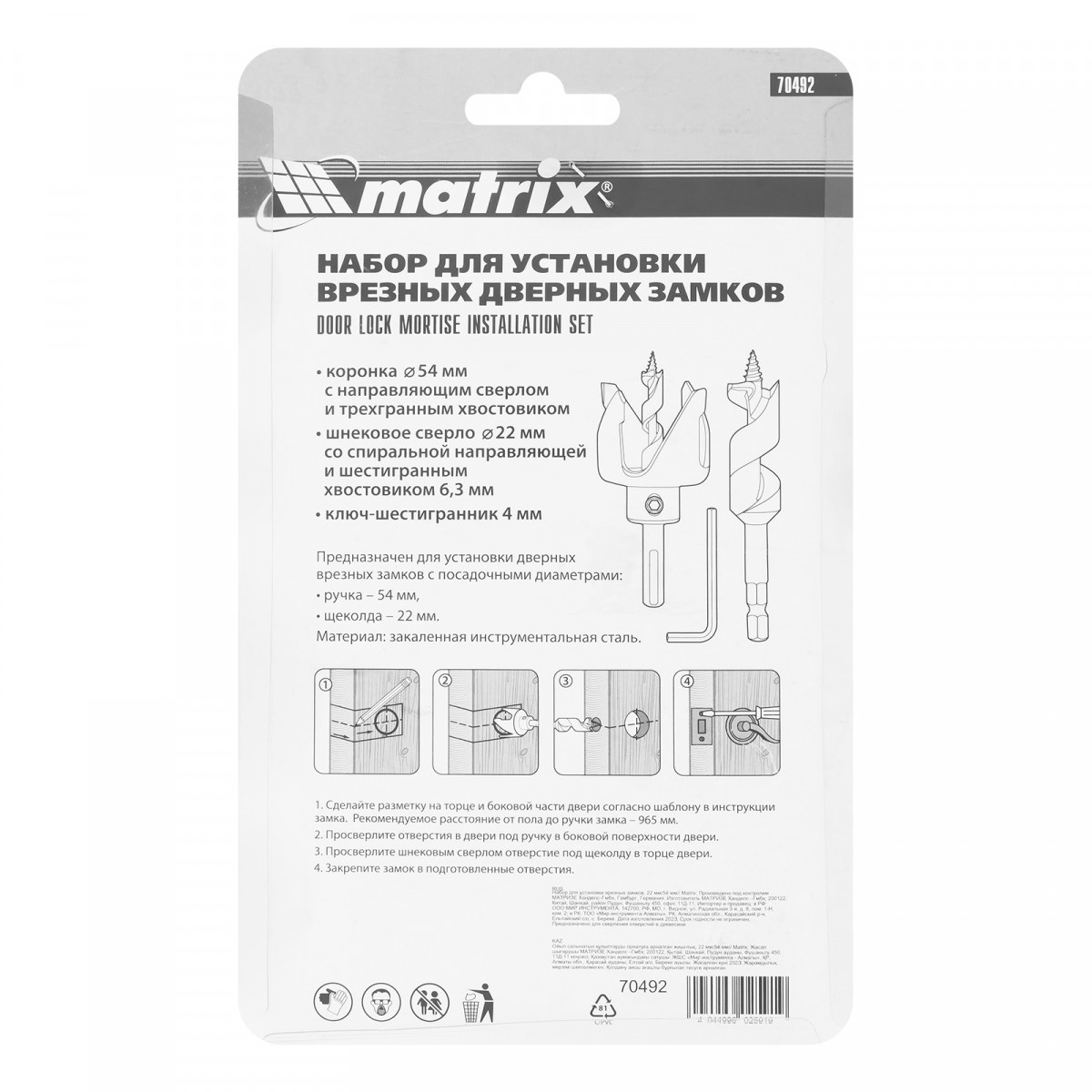 Набор Matrix 70492 включает в себя все необходимое для установки врезных замков: ключ-шестигранник 4 мм, коронку 54 мм с направляющим сверлом и спиральное сверло 22 мм. Используется при монтаже дверей, пригодится как частному мастеру, так и профессионалу.