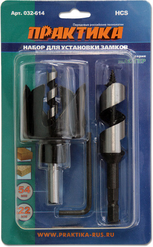Набор для замков Практика включает в себя сверло диаметром 22 мм, идеально подходящее для установки замков диаметром 54 мм. Комплект также включает держатель для удобства использования.
