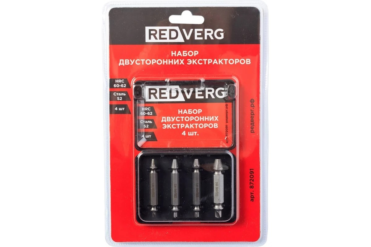 Набор двусторонних экстракторов REDVERG сталь S2, 4 шт. 872091 6667869 используются для извлечения саморезов и болтов с сорванной резьбой.