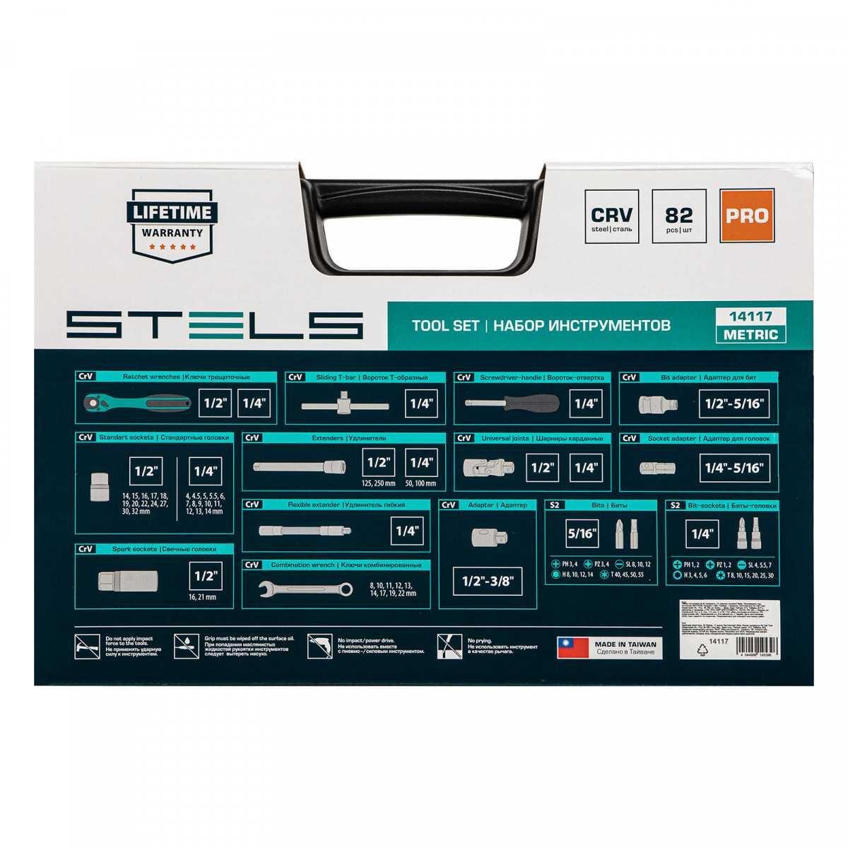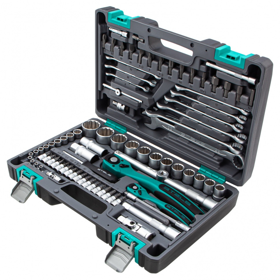 Набор инструментов Stels 14117 в ударопрочным пластиковом кейсе состоит из 82 предметов с присоединительными квадратами 1/2″ и 1/4″, из стали CrV и S2, и предназначен для выполнения слесарно-монтажных работ. Включает инструменты и насадки для работы с резьбовыми крепежами, в том числе 12-гранные торцевые головки, т-образный вороток и удлинители (в том числе гибкий), облегчающие работу в труднодоступных местах. Набор предназначен для профессионального использования в автомастерской, будет полезен и для решения бытовых задач.