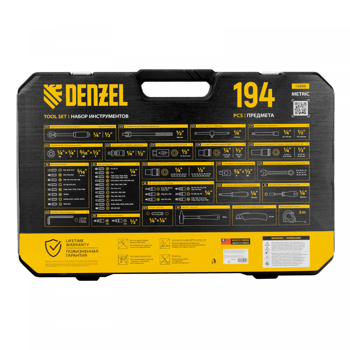 Набор инструментов Denzel 15806 состоит из 194 предметов с присоединительными квадратами 1/4″ и 1/2″, упакованных во вместительный ударопрочный кейс собственной разработки с антивандальным покрытием. В комплект поставки входят инструменты и оснастка для монтажа и демонтажа резьбовых соединений, а также молоток для выполнения ударных работ, рулетка для проведения измерений и нож для резки материалов. Набор предназначен для профессионального использования в автомастерской, будет полезен и для решения бытовых вопросов.