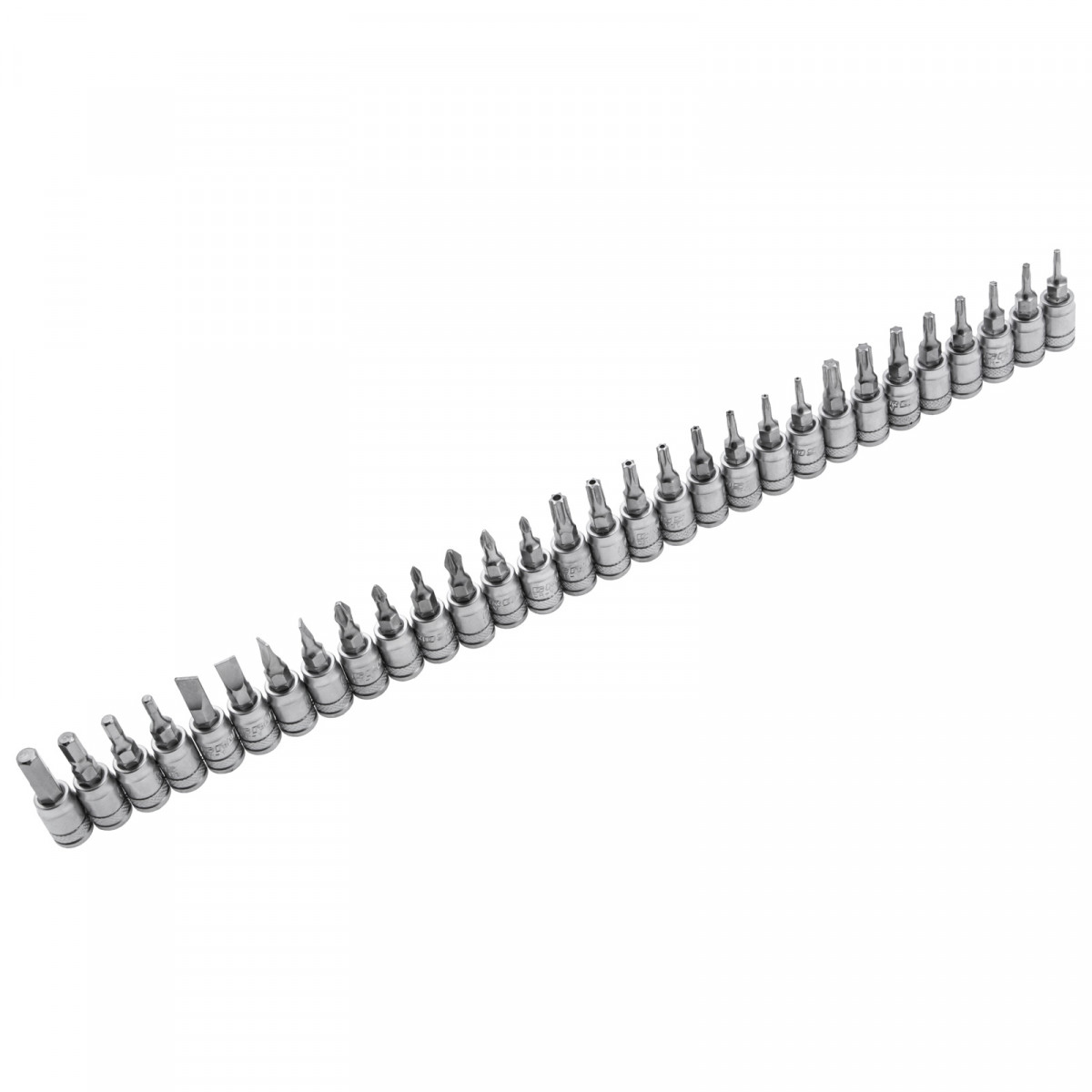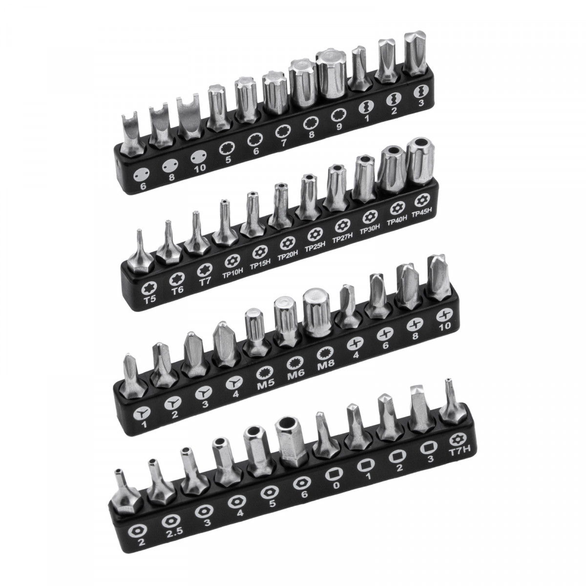 - Исключительная твердость и прочность — биты и шестигранные ключи изготовлены из японской легированной стали S2, остальные элементы набора выполнены из хромованадиевой стали.
